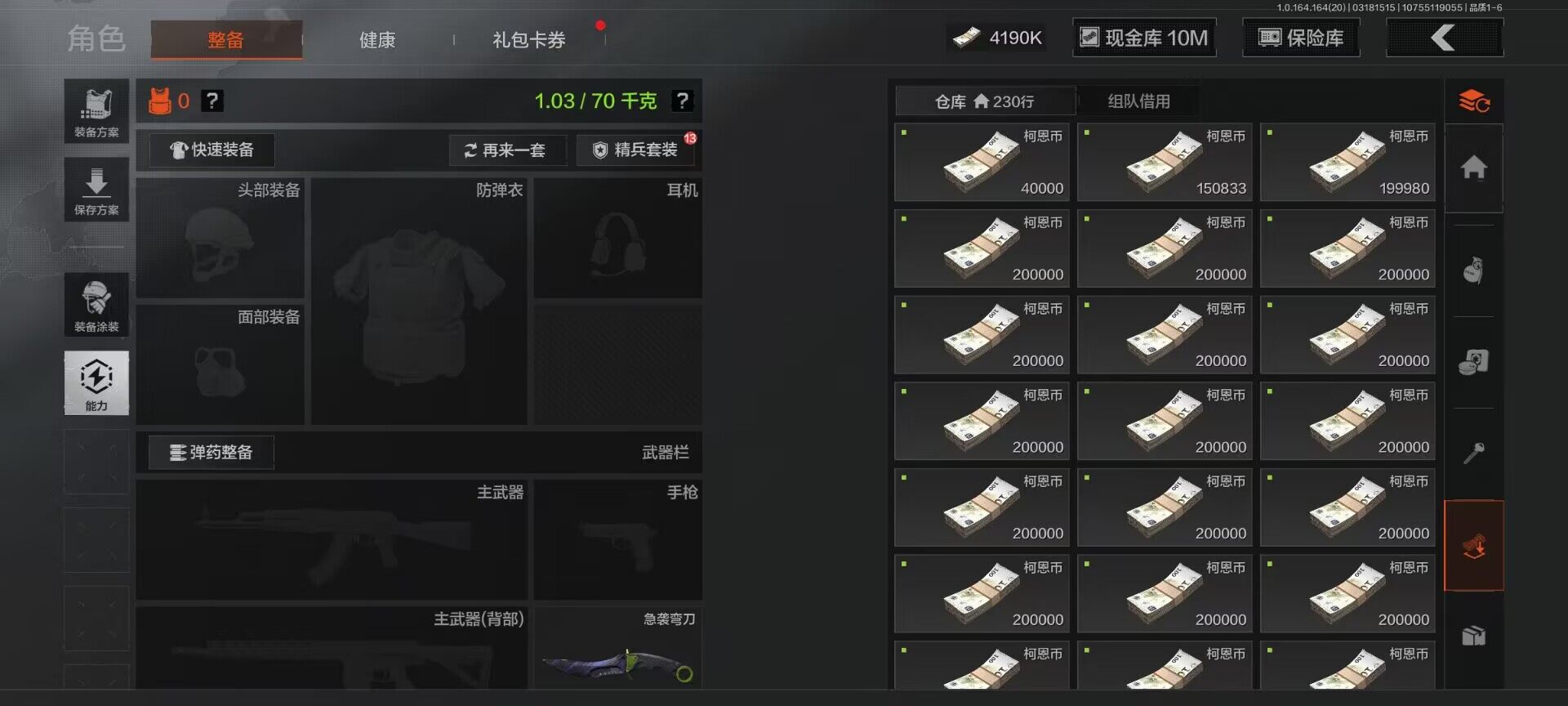 等级:30/段位:暗区传说/仓库价值(百万):113.7/柯恩币:10000000/急袭弯刀/S-07折刀/赢家匕首/冥河/深潜行者II/