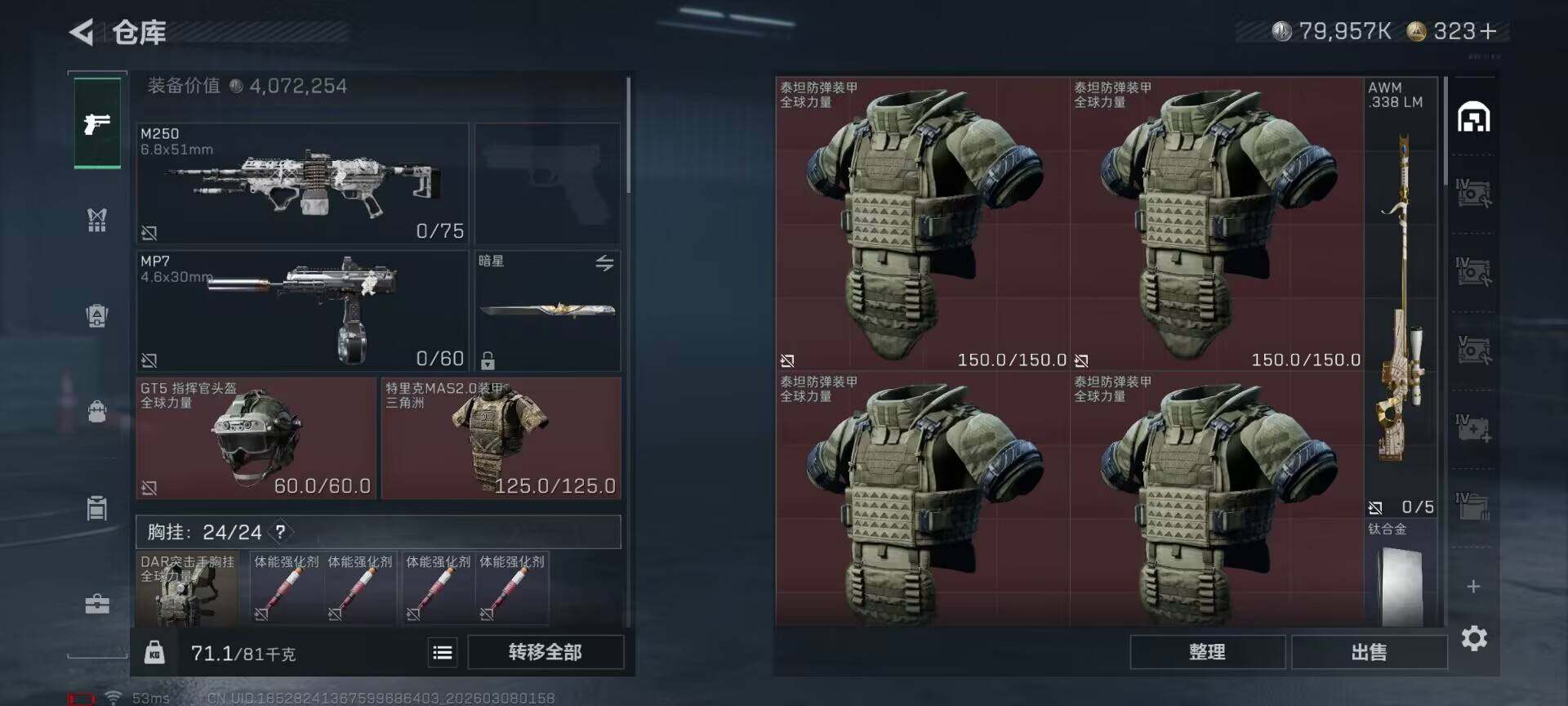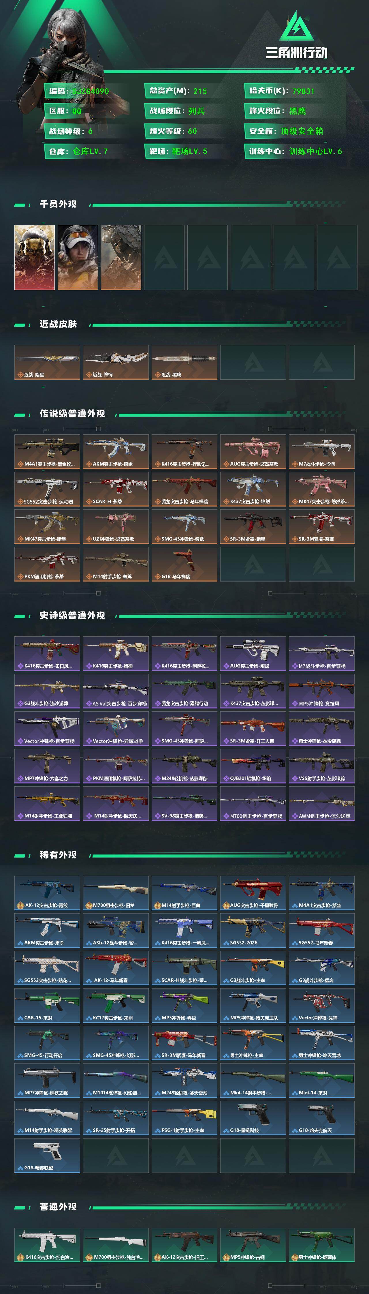 【SJZG4090】总资产(M):215M/哈夫币(K):79831K/哈夫币(K):79831K/传说枪皮数:18/全面战场等级:6_段位:列兵/烽火地带等级:60_段位:黑鹰/红狼-蚀金玫瑰/露娜-金牌射手/乌鲁鲁-荒原猎手/近战-暗星/近战-怜悯/近战-黑鹰/M4A1突击步枪-蚀金玫瑰/AKM突击步枪-锦绣/K416突击步枪-行动记录/AUG突击步枪-悠然茶歇/M7战斗步枪-怜悯/SG552突击步枪-运动员/SCAR-H战斗步枪-荼蘼/腾龙突击步枪-马年祥瑞/K437突击步枪-锦绣/MK4