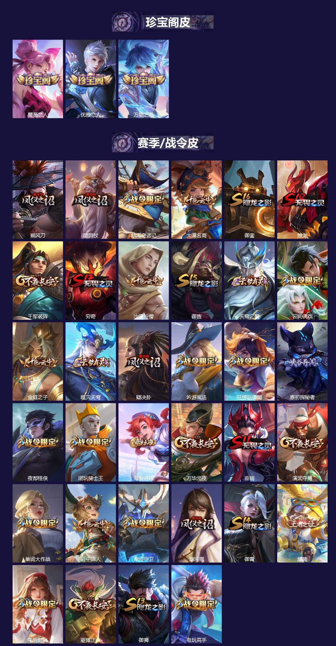 【传说皮】黄金白羊座,零号·赤焰,仲夏夜之梦(大飞蛾),地狱之眼,云霓雀翎,一念神魔,云鹰飞将(小将军),炽阳神光,无双飞将,超时空战士-狄仁杰