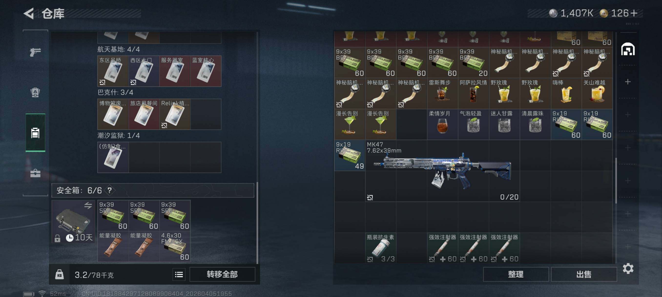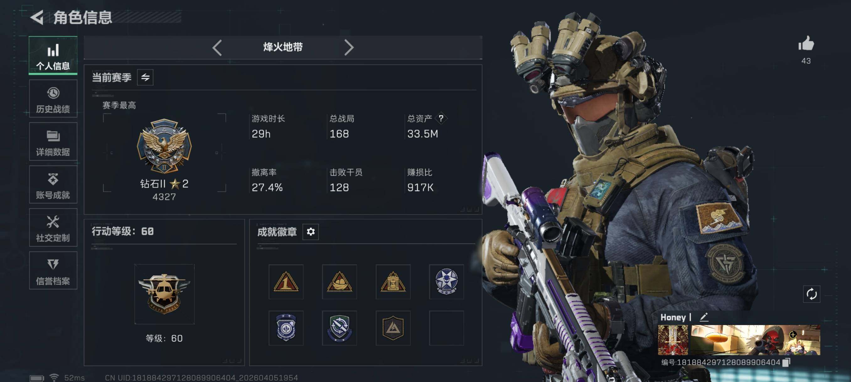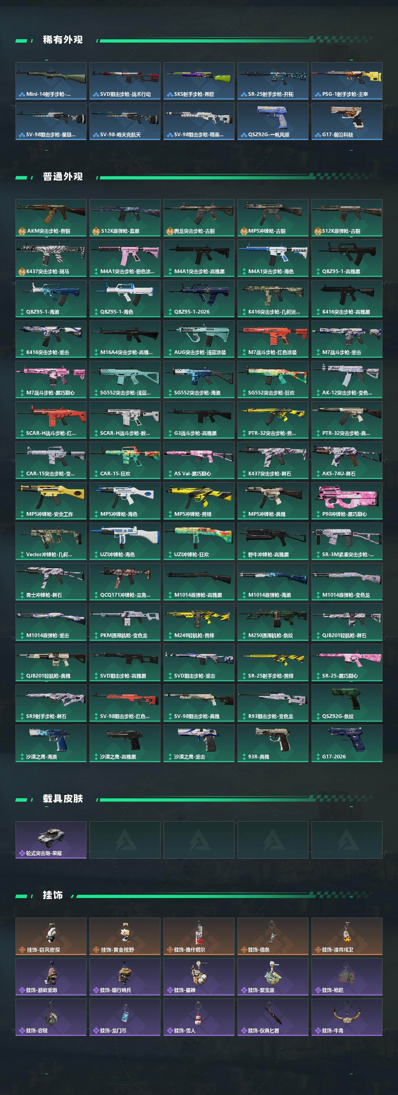 总资产33M/哈夫币140万/传说近战数1/传说枪皮数24/战场等级29/行动等级60/安全箱等时效性道具以游戏内数据为准,详情请看图/红狼-电锯惊魂/露娜-金牌射手/近战-信条/近战-处刑者/近战-黑鹰/M4A1突击步枪-阿米娅/ASh-12战斗步枪-鹅鸭杀/K416突击步枪-行动记录/SG552突击步枪-运动员/SCAR-H战斗步枪-启航/CAR-15突击步枪-阿米娅/腾龙突击步枪-马年祥