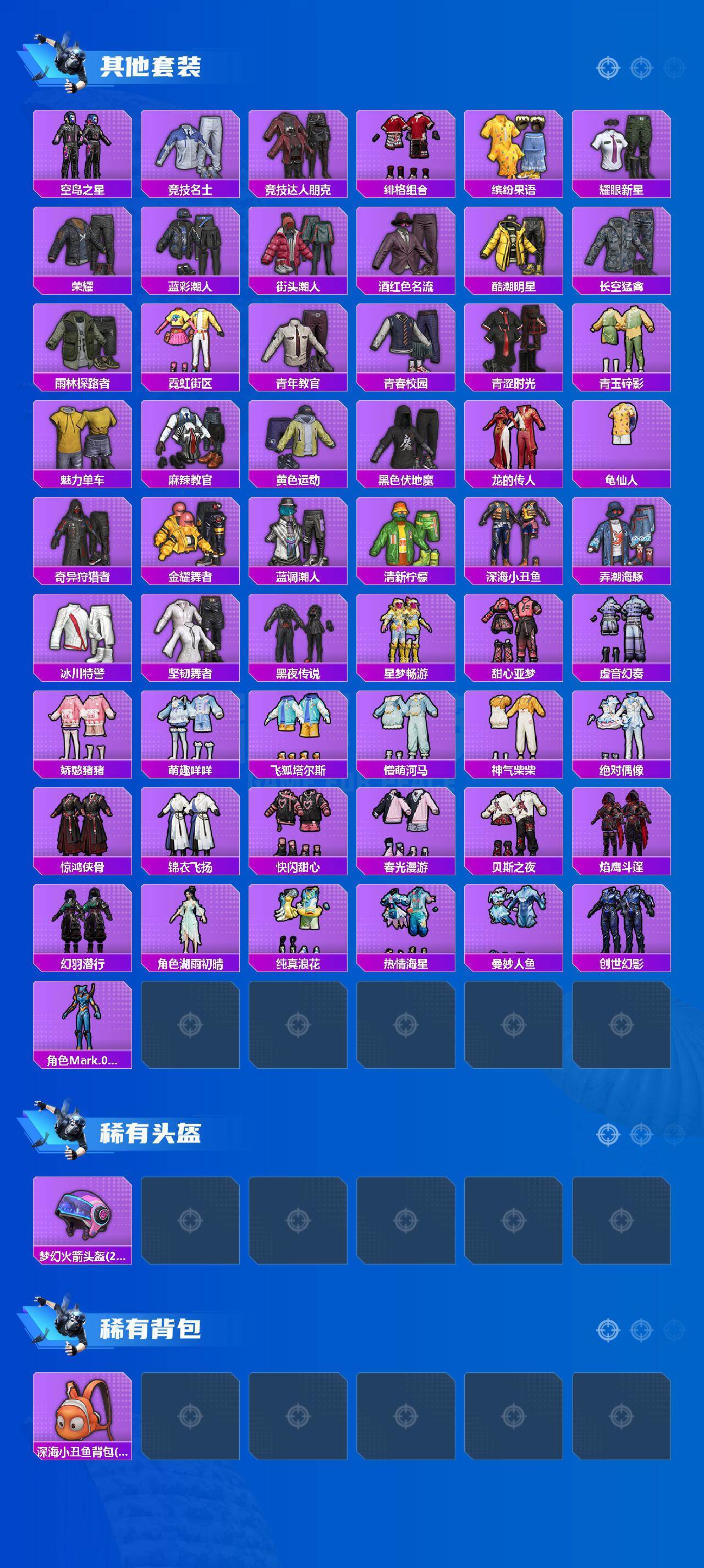 【热门品类】:套装-派对舞王,套装-深海小丑鱼,套装-奇异狩猎者,套装-龟仙人,角色-Mark.06,撬棍-