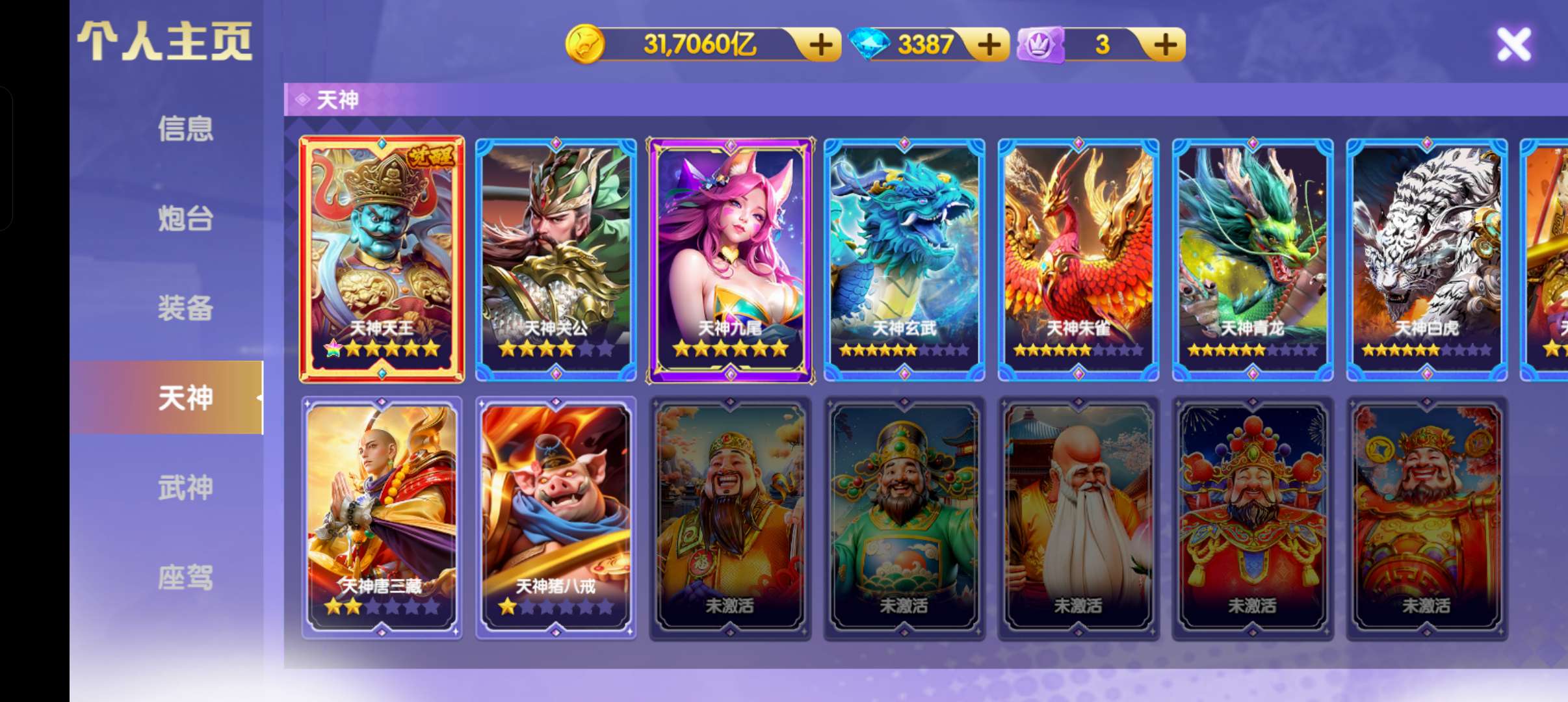 全部神装套,神电11星,觉醒天王,狐狸天神再养一养也快能觉醒了,绝对超值