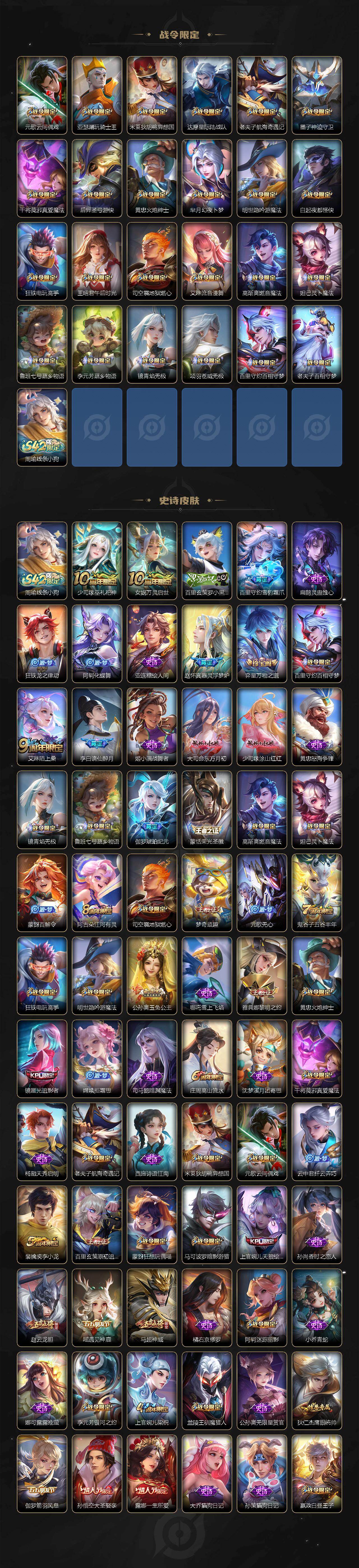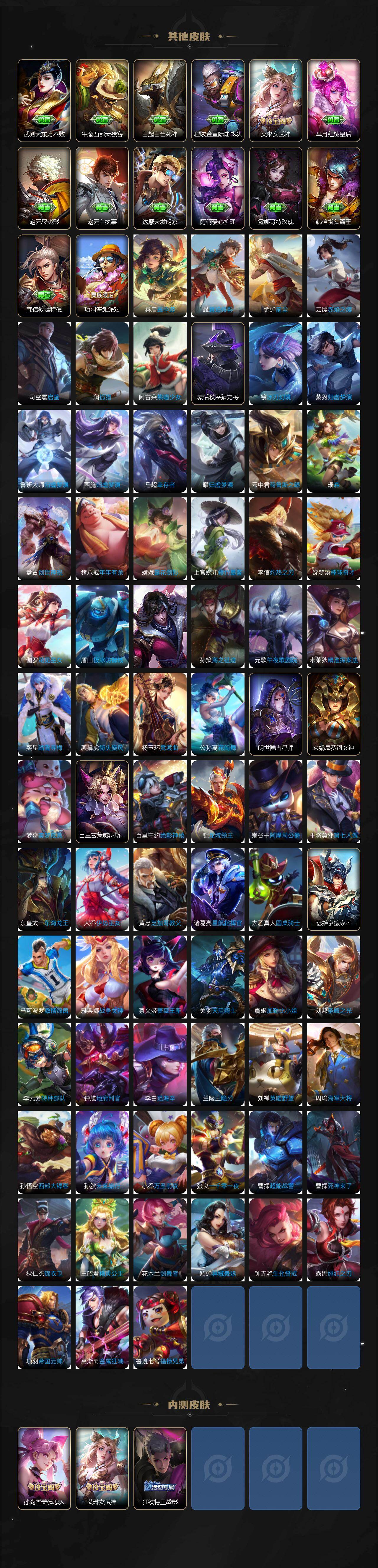 【英雄全皮】:露娜全皮,刘邦全皮,狂铁全皮,敖隐全皮,影全皮,少司缘全皮