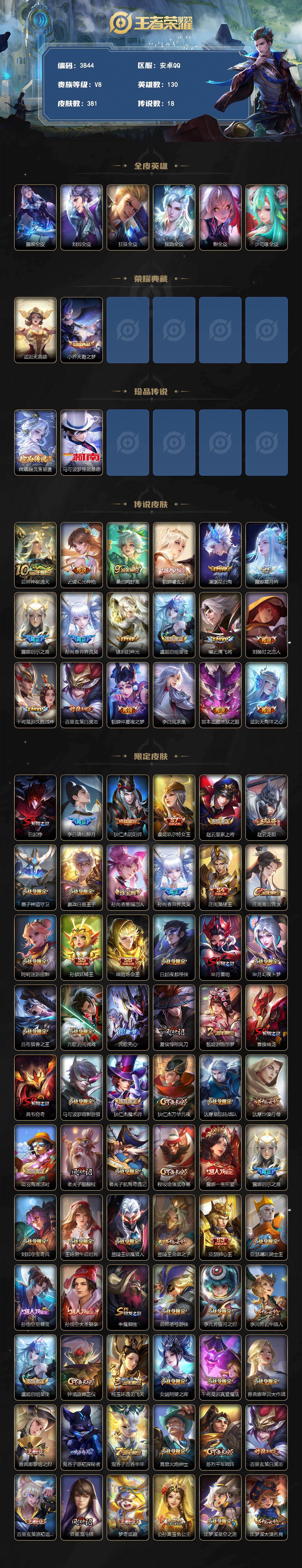 【3844】安卓Q-V8-至尊星耀III段位-130英雄-381皮肤-1典藏皮肤-1典藏英雄-2珍品传说-18传说-114史诗