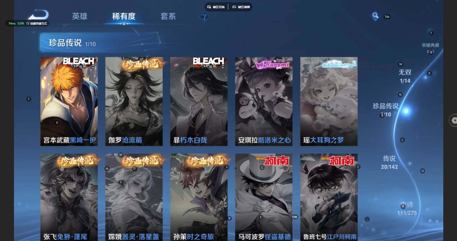V8-最强王者段位-128英雄-359皮肤-2典藏皮肤-1无双-1珍品传