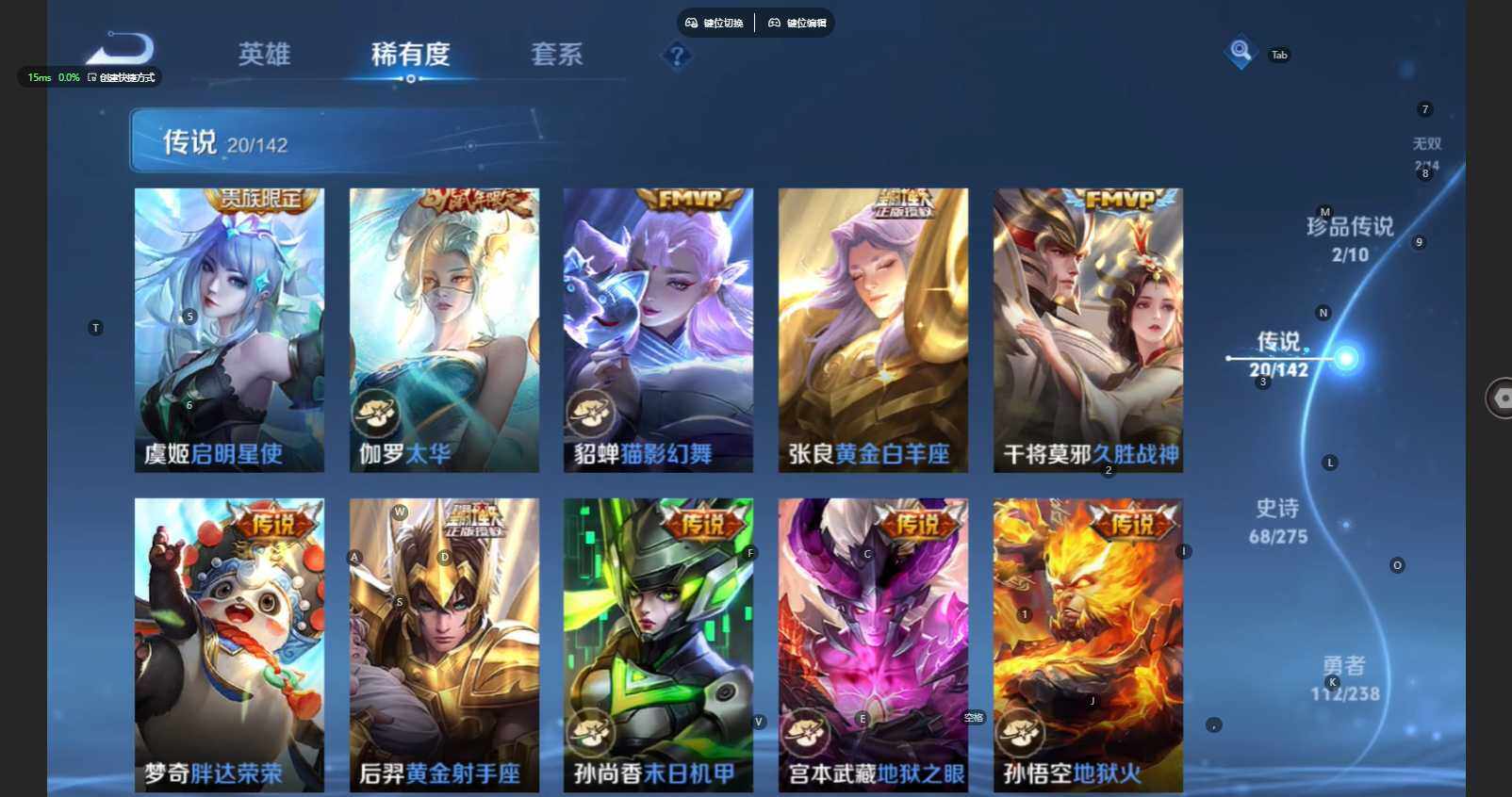 苹果Q-V8-至尊星耀II段位-126英雄-257皮肤-1典藏皮肤-1珍品无双-2无双-2珍品传说-20传说-67史诗
