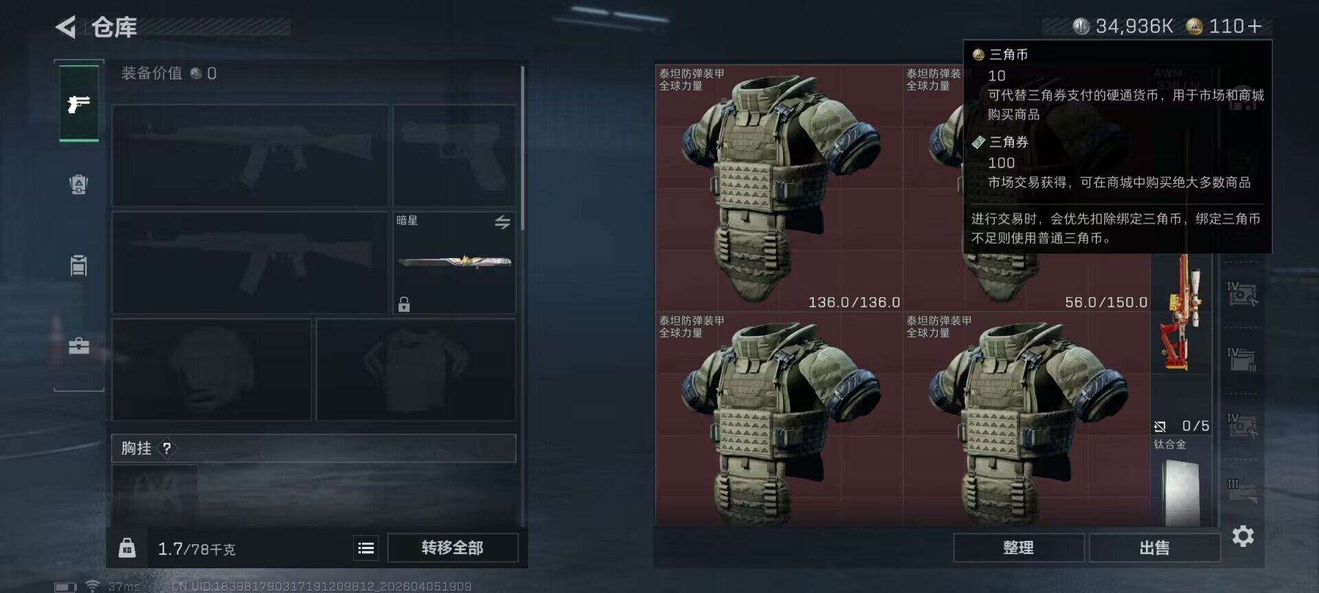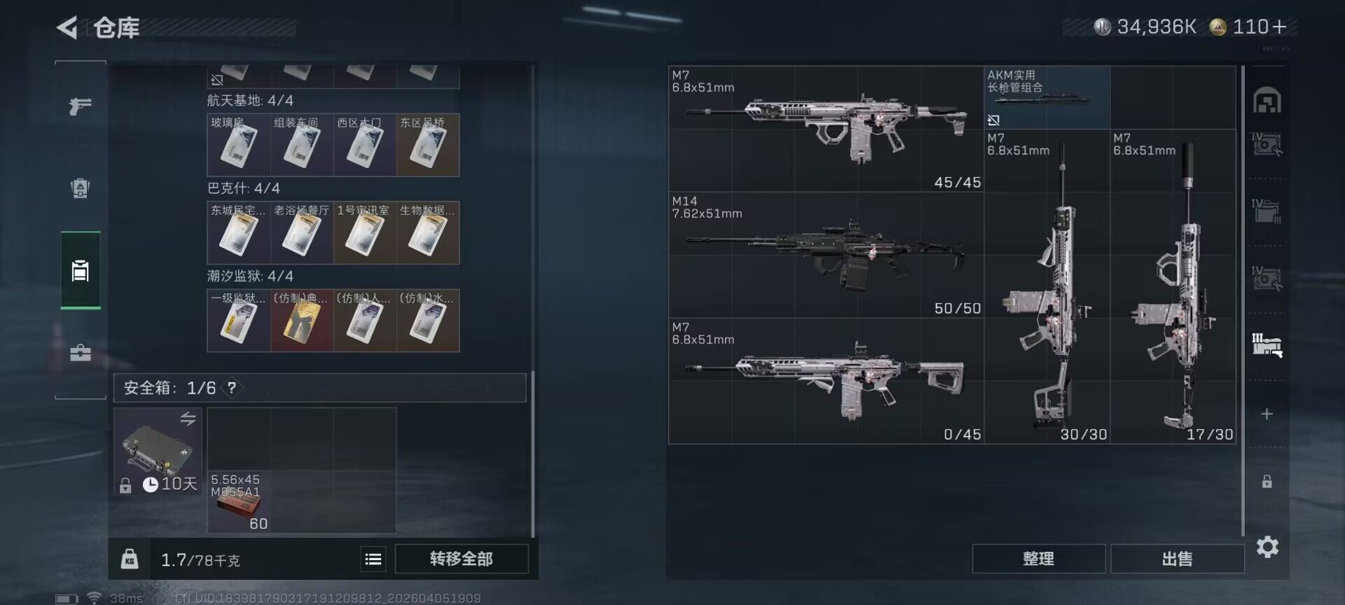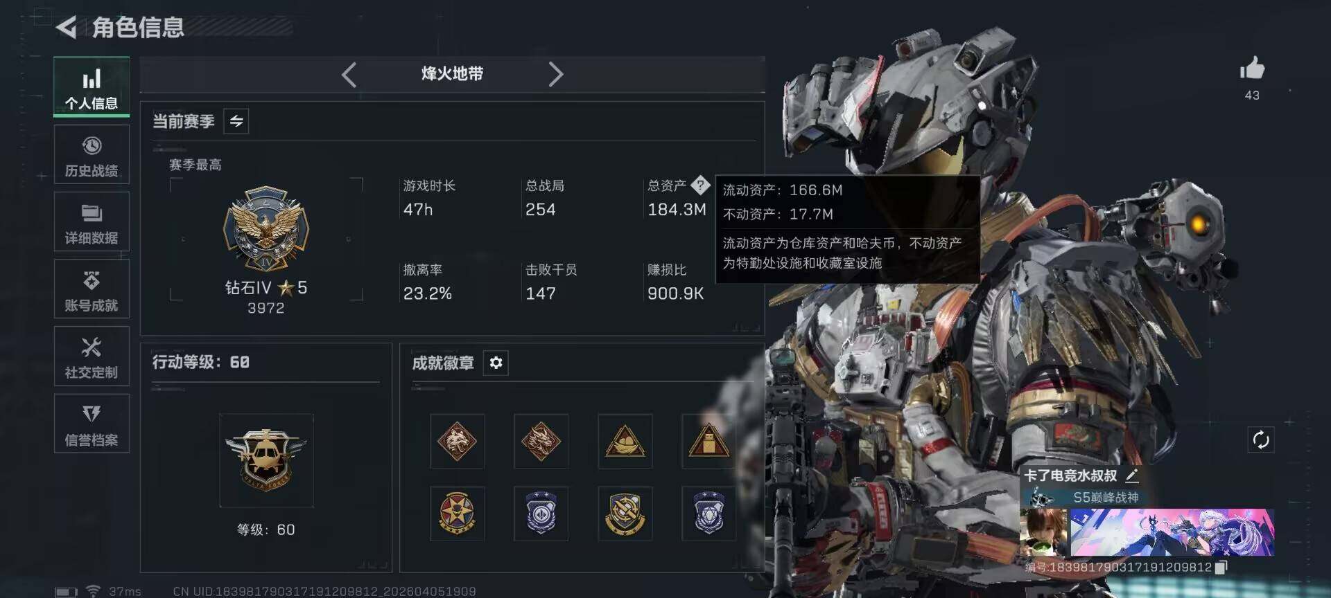 总资产(M):184M/哈夫币(K):34936K/传说枪皮数:44/全面战场等级:10_段位:列兵/烽火地带等级:60_段位:钻石