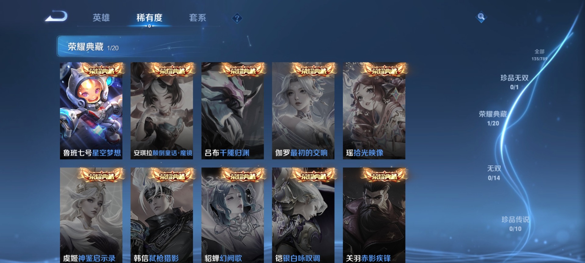 【稀有英雄】大司命,嬴政(始皇帝),韩信(韩跳跳),夏洛特(夏师傅),艾琳,橘右京(橘子),娜可露露(鸟人),不知火舞,赵云,戈娅