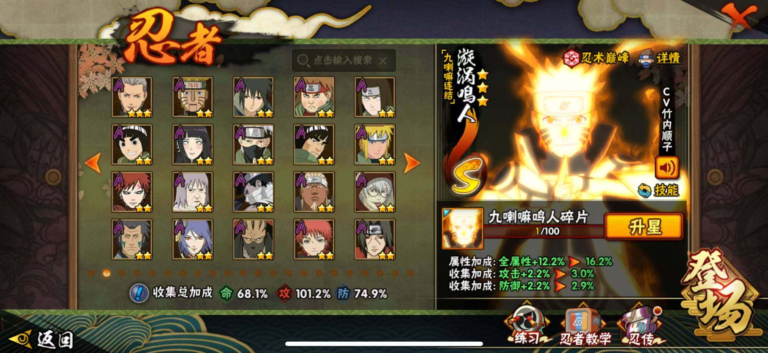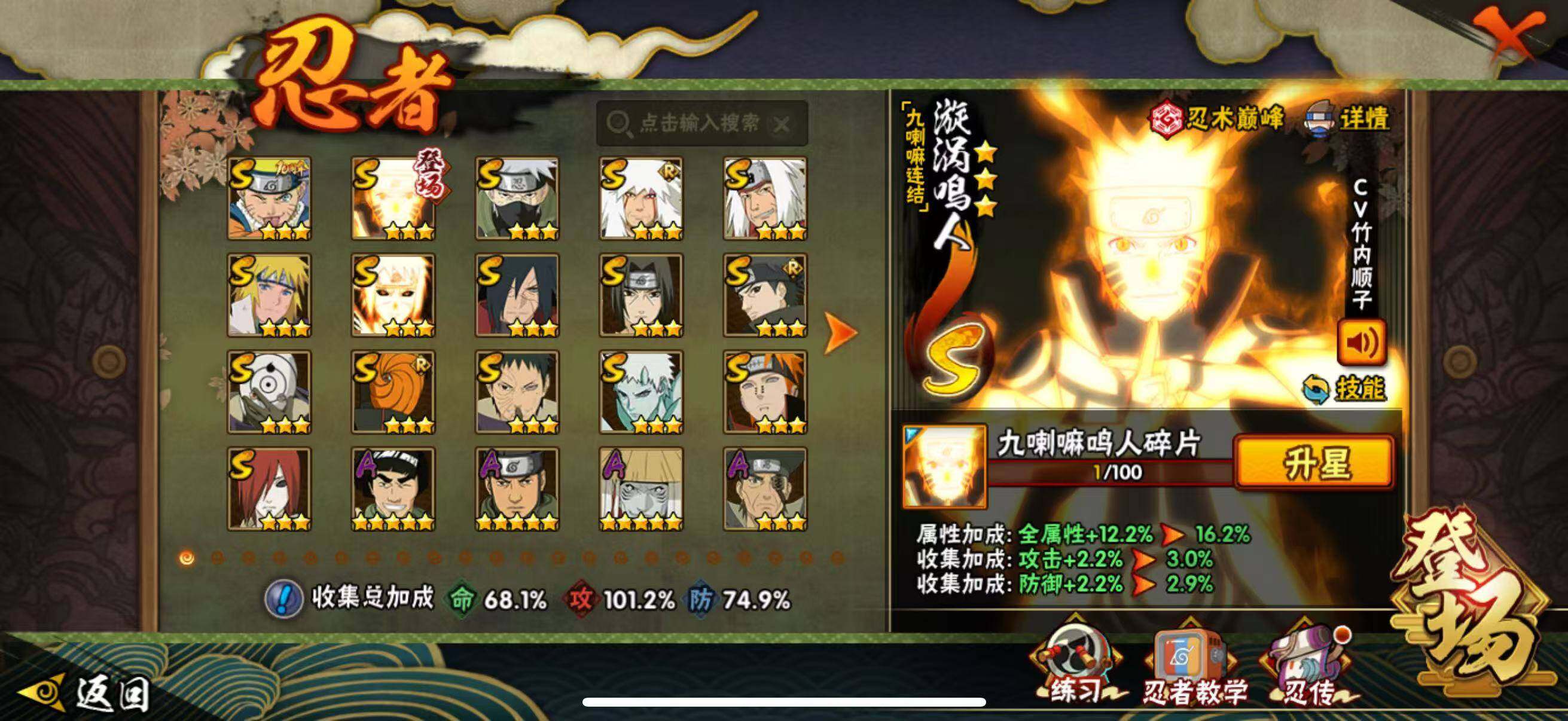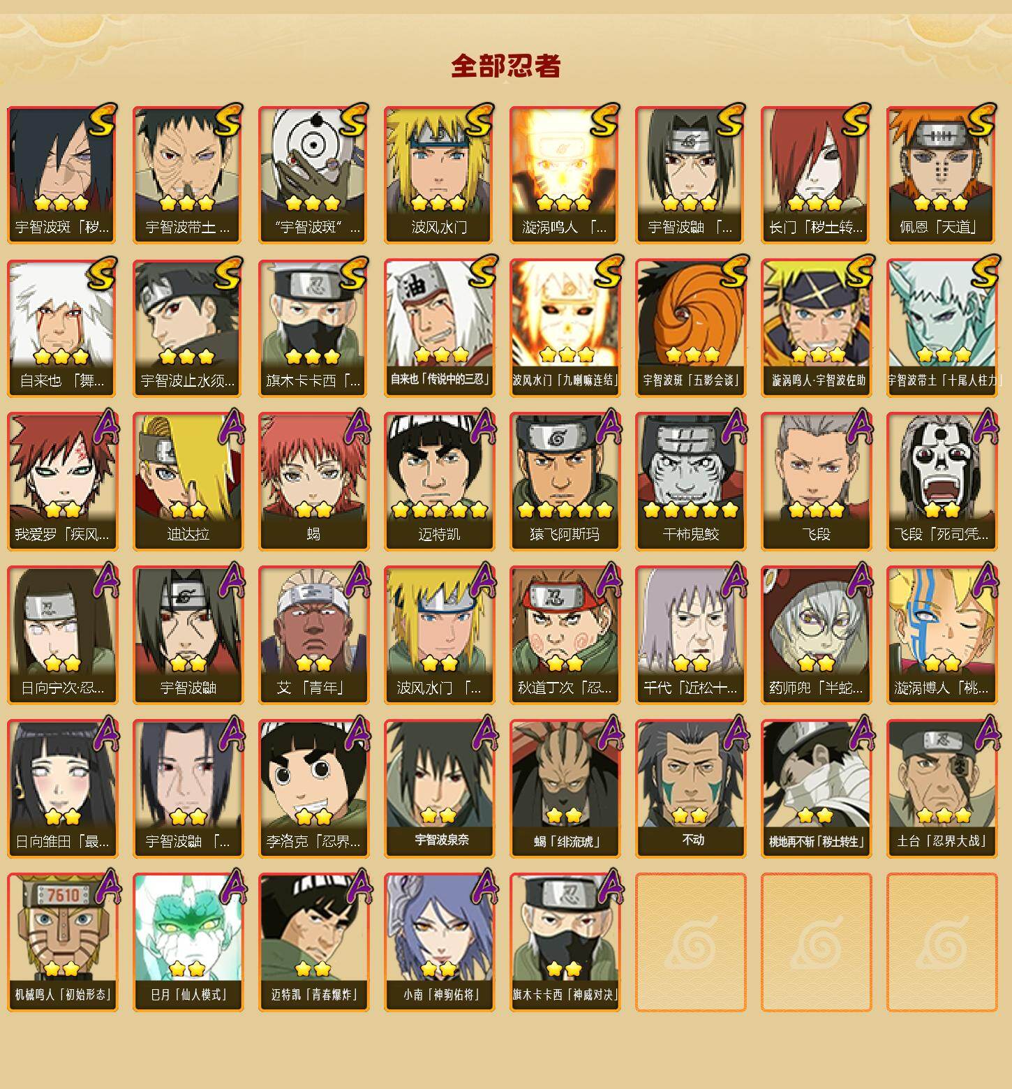【S级忍者】:长门「秽土转生」(3星),宇智波斑「秽土转生·解」(3星),宇智波带土「忍界大战」(3星),宇智波鼬「须佐能乎」(3星),宇智波止水「须佐能乎」(3星),旗木卡卡西「须佐能乎」(3星),自来也「舞之豪杰」(3星),自来也「传说中的三忍」(3星),波风水门(3星),漩涡鸣人「九喇嘛连结」(3星),佩恩「天道」(3星),宇智波斑 「白面具」(3星宇智波斑「白面具」),波风水门「九喇嘛连结」(3星),宇智波斑「五影会谈」(3星),漩涡鸣人·宇智波佐助(3星