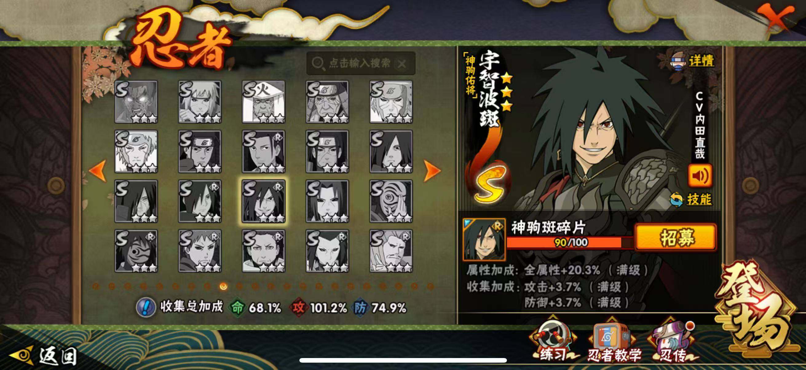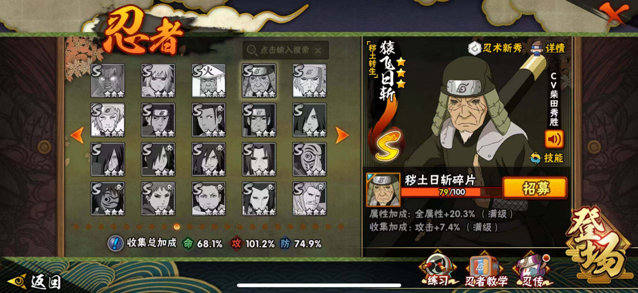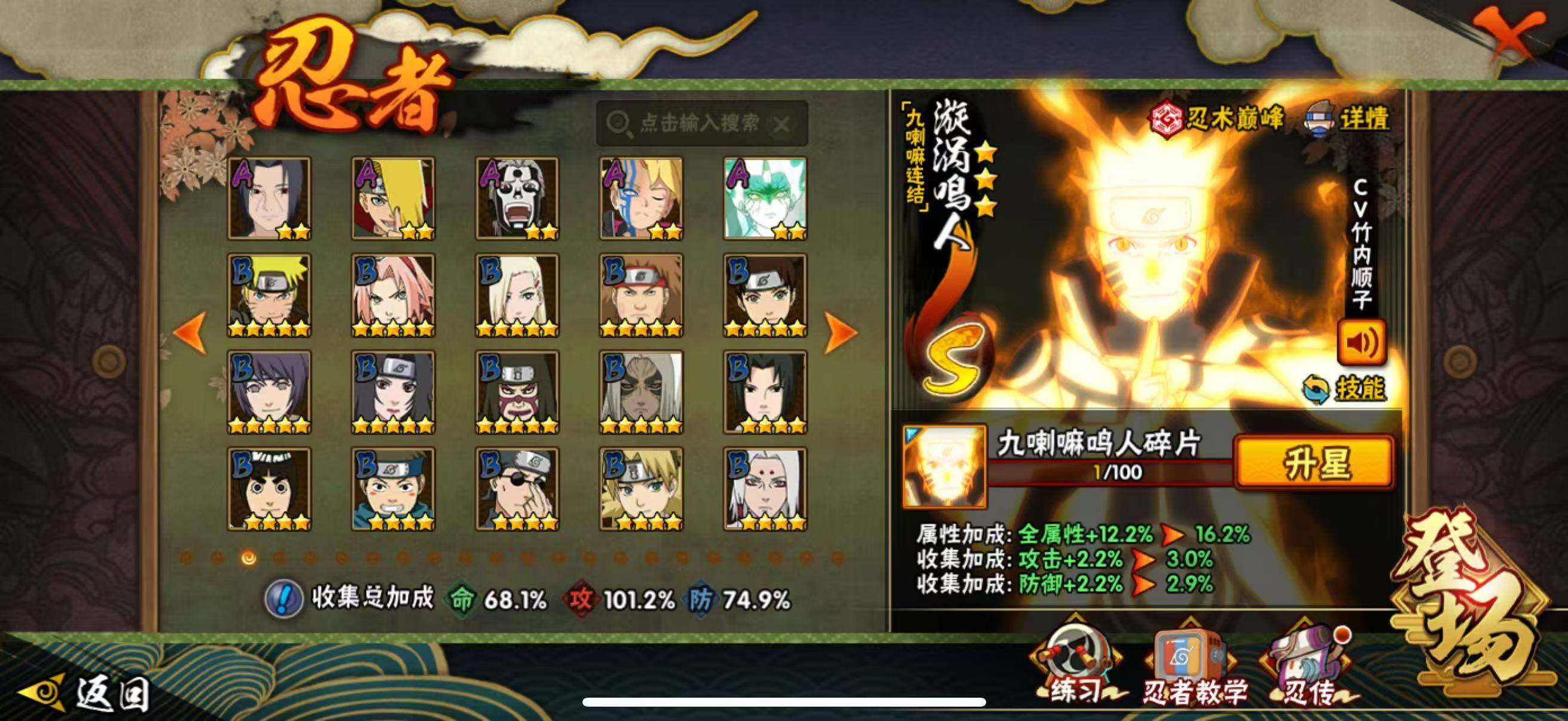 【S级忍者】:长门「秽土转生」(3星),宇智波斑「秽土转生·解」(3星),宇智波带土「忍界大战」(3星),宇智波鼬「须佐能乎」(3星),宇智波止水「须佐能乎」(3星),旗木卡卡西「须佐能乎」(3星),自来也「舞之豪杰」(3星),自来也「传说中的三忍」(3星),波风水门(3星),漩涡鸣人「九喇嘛连结」(3星),佩恩「天道」(3星),宇智波斑 「白面具」(3星宇智波斑「白面具」),波风水门「九喇嘛连结」(3星),宇智波斑「五影会谈」(3星),漩涡鸣人·宇智波佐助(3星