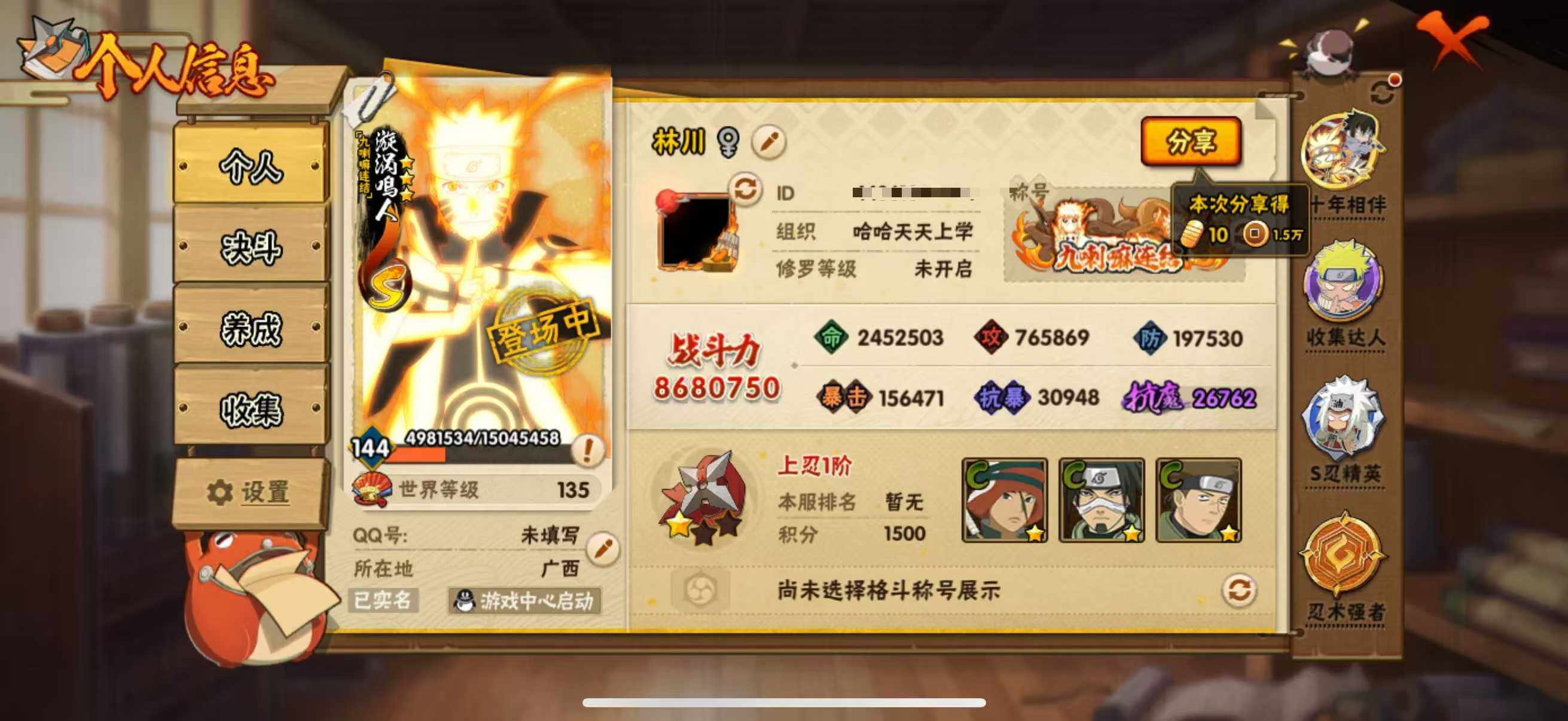 16S级忍者数-29A级忍者数【S级忍者】:长门「秽土转生」(3星)