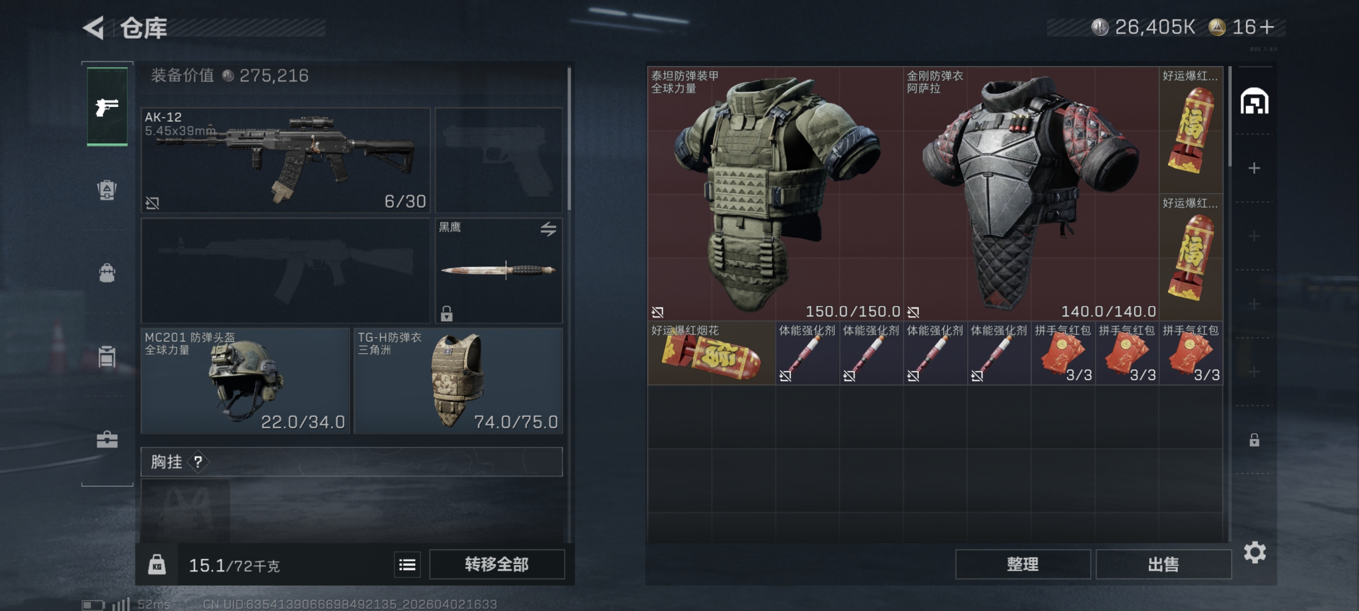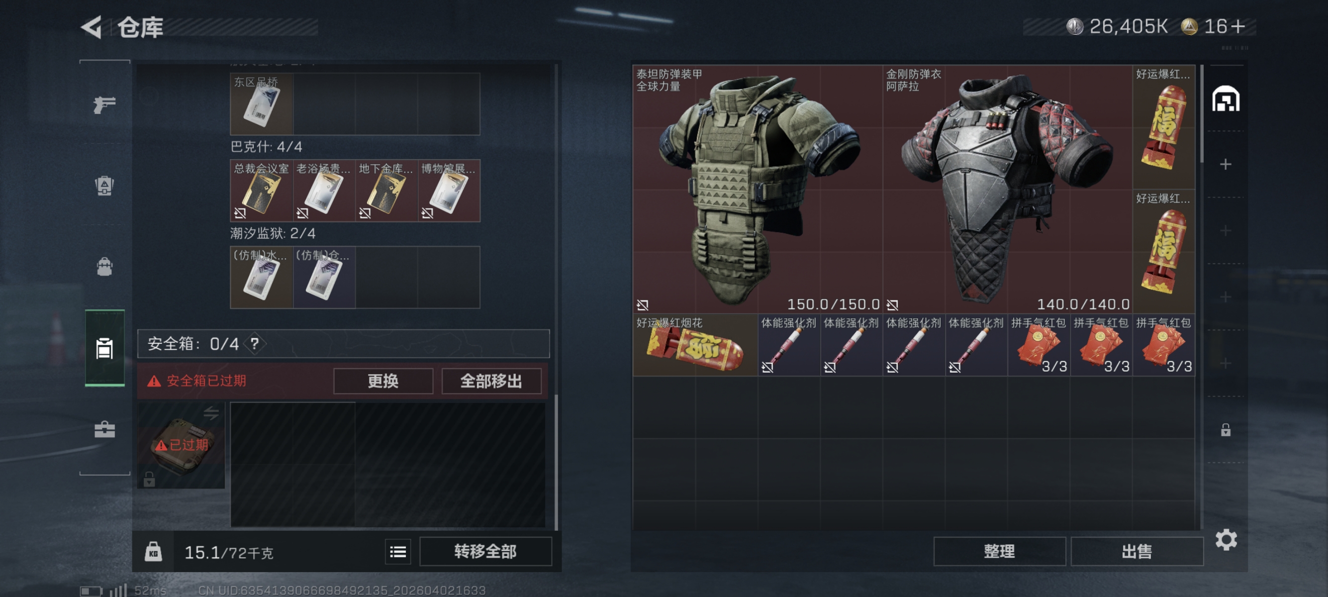 总资产36M,哈夫币26,405K,行动等级:29,仓库等级:5级,训练中心等级:1级,靶场等级:1级,枪皮:36