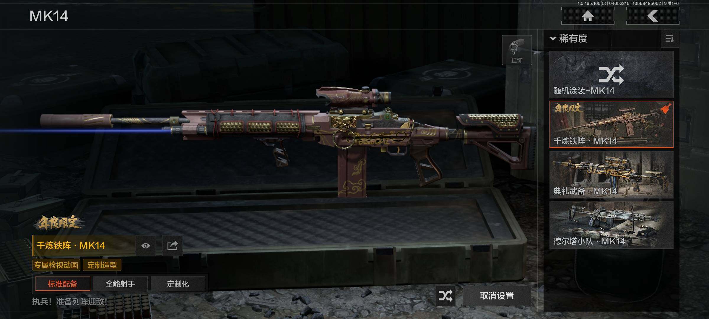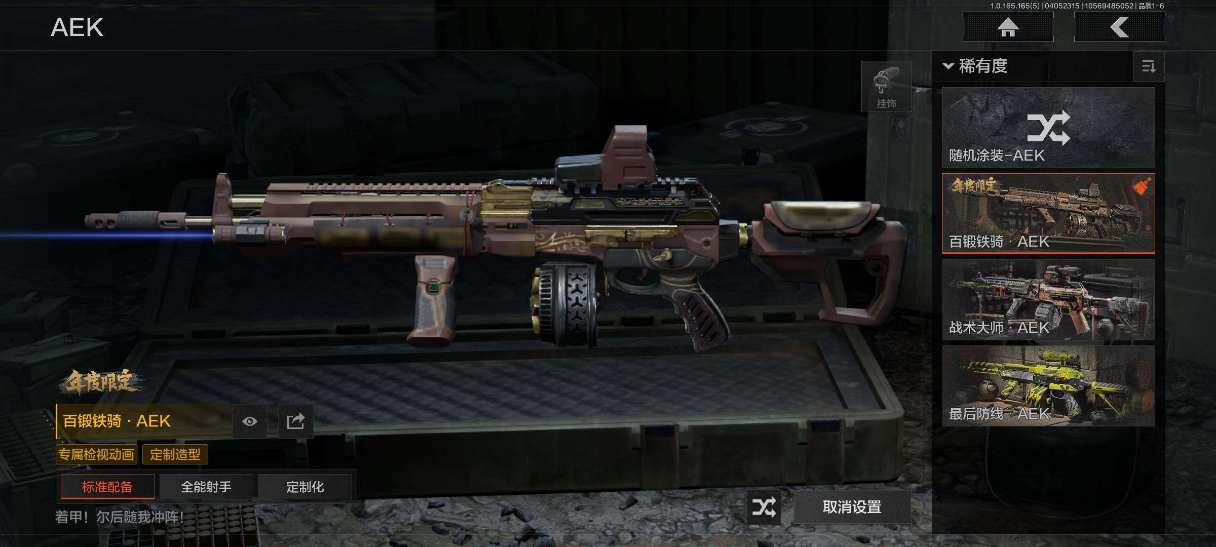 【金色枪皮】:千炼铁阵MK14,利齿风暴MPX,百锻铁骑AEK,战术大师AEK,镀火熔金H416