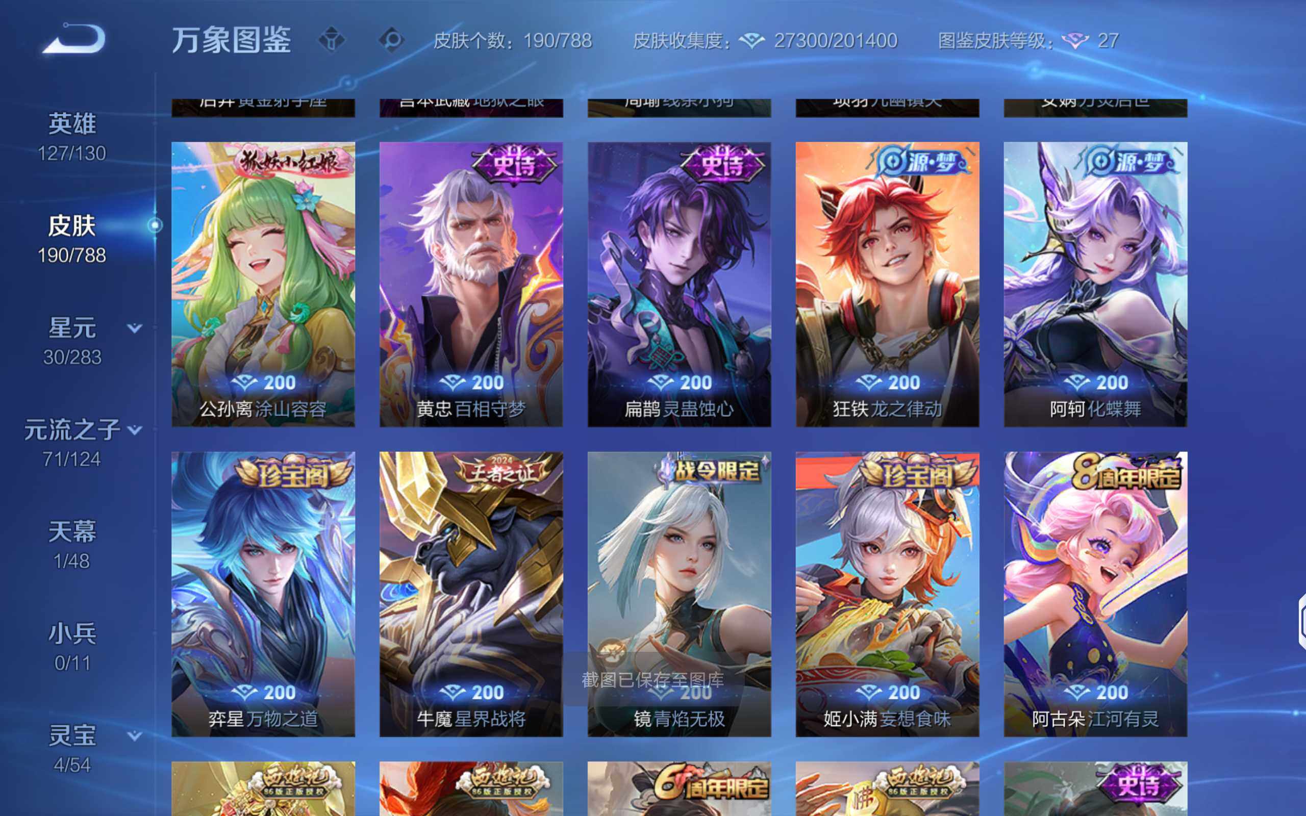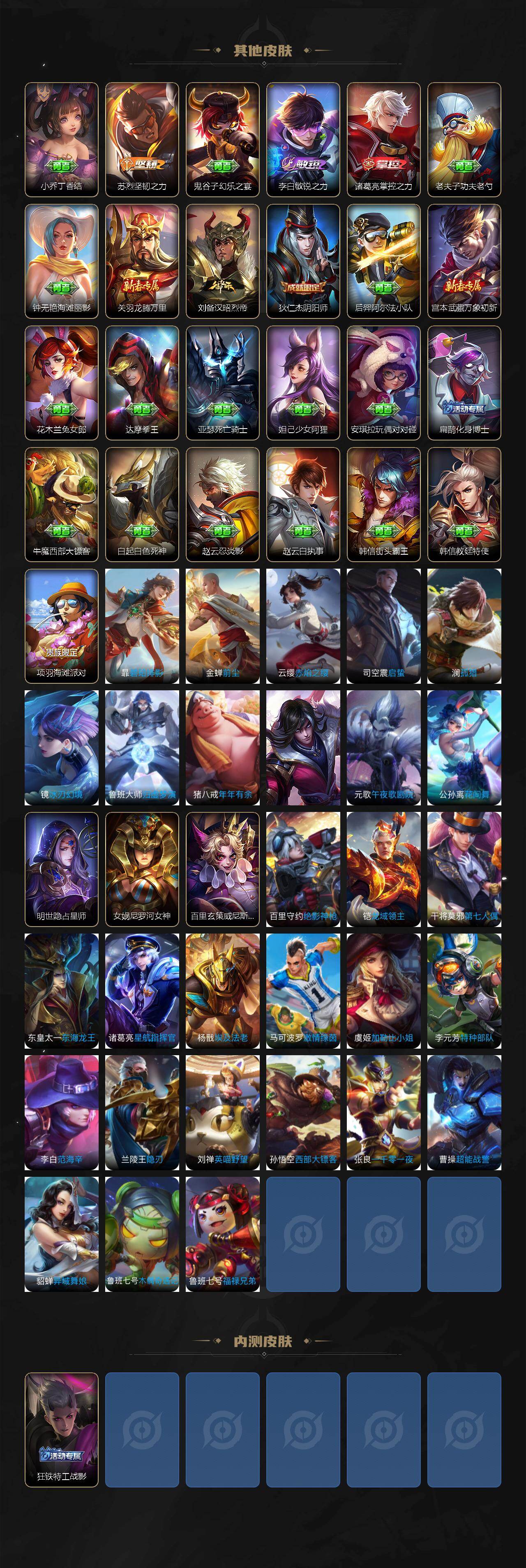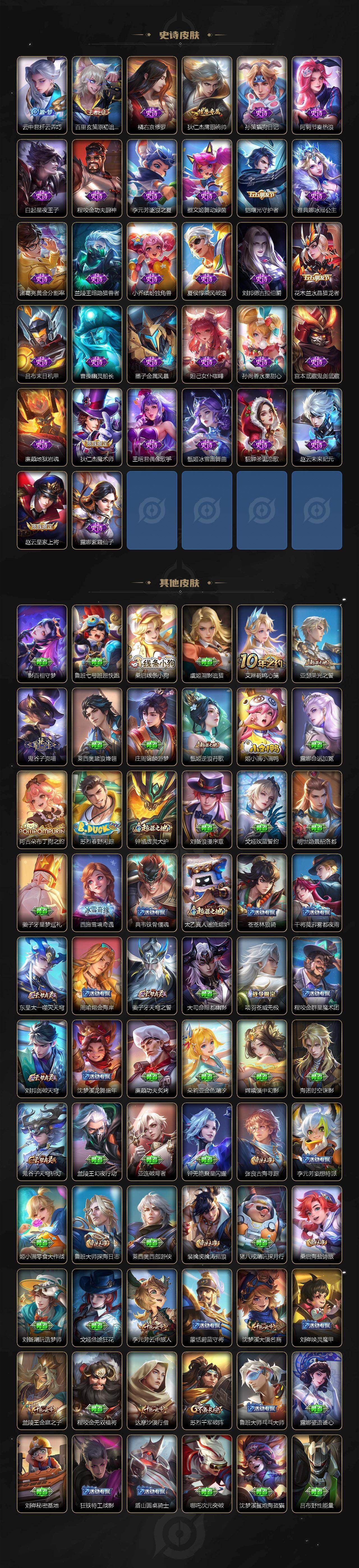 【传说皮肤】:云缨幻光神枪,桑启鸣野蒿,典韦战鼓燎原,澜逐花归海,露娜霜月吟,宫本武藏惊梅引,云缨鹤归松栖,吕布怒海麟威,李白诗剑行,百里守约碎云,马超无双飞将,赵云淬星耀世,孙悟空零号赤焰,曜云鹰飞将,李信一念神魔,后羿黄金射手座,宫本武藏地狱之眼