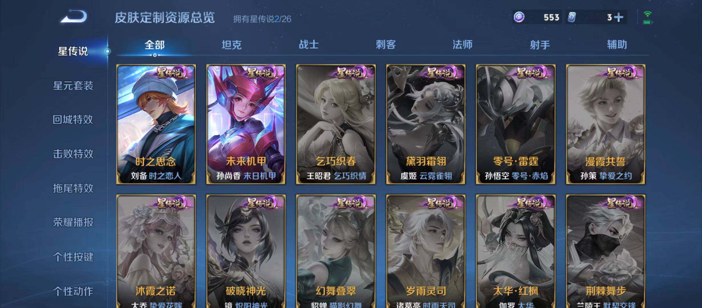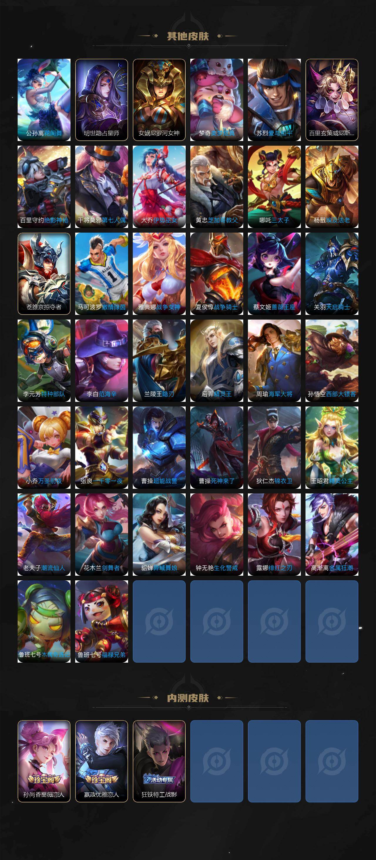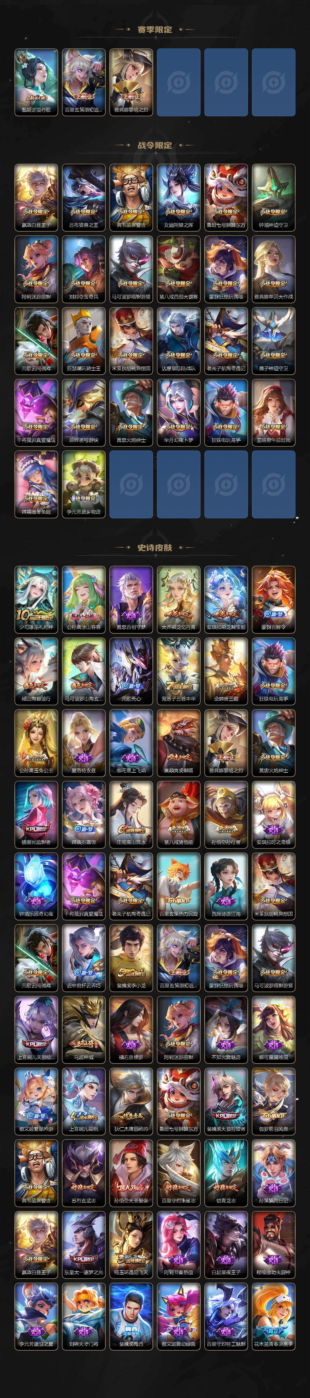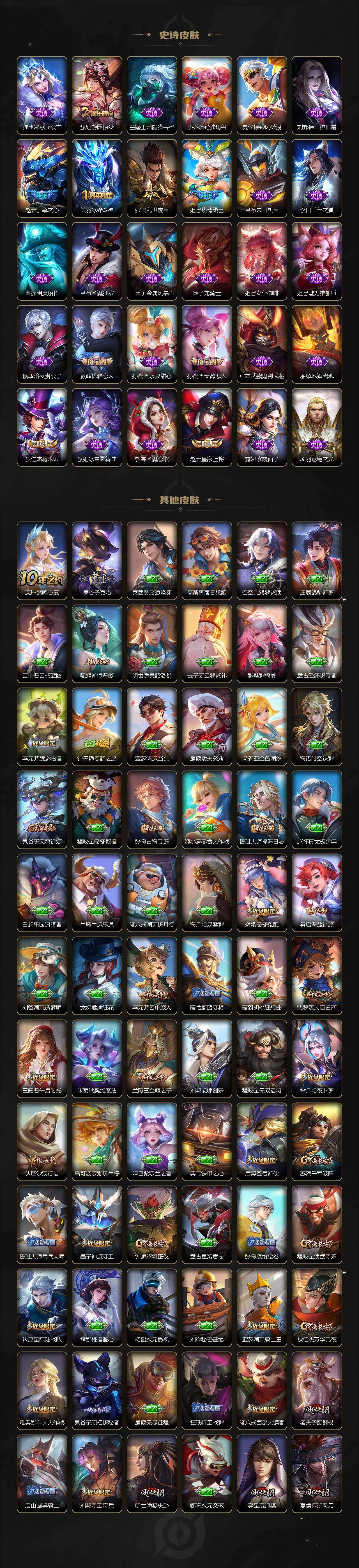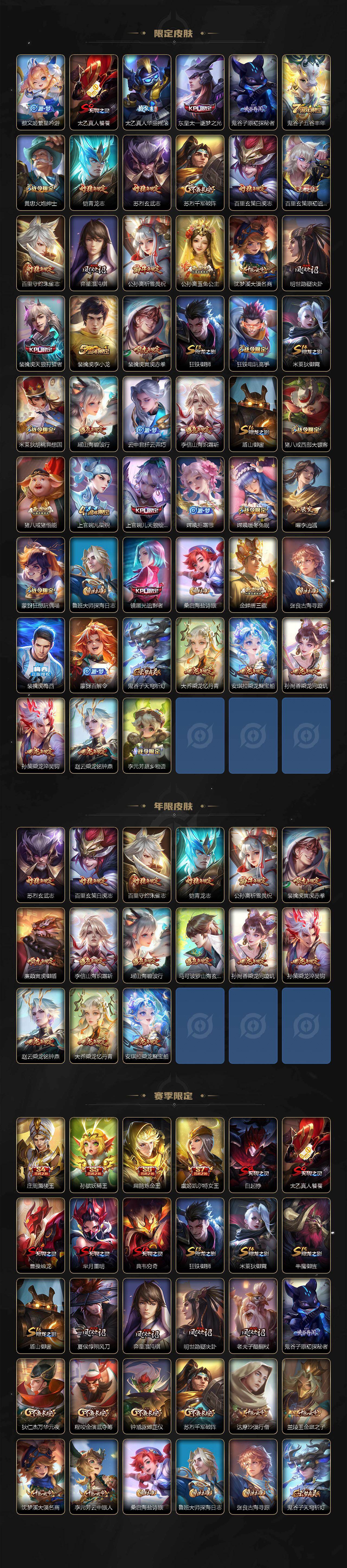 【传说皮肤】:后羿神树通天,孙尚香乘龙问璇玑,孙策乘龙淬吴钩,赵云乘龙铭钟鼎,孙悟空齐天大圣,李信山海炽霜斩,裴擒虎寅虎赤拳,孙尚香异界灵契,赵云淬星耀世,王昭君乞巧织情,曜李逍遥 ,公孙离祈雪灵祝,镜炽阳神光,虞姬启明星使,关羽武圣,曜云鹰飞将,李信一念神