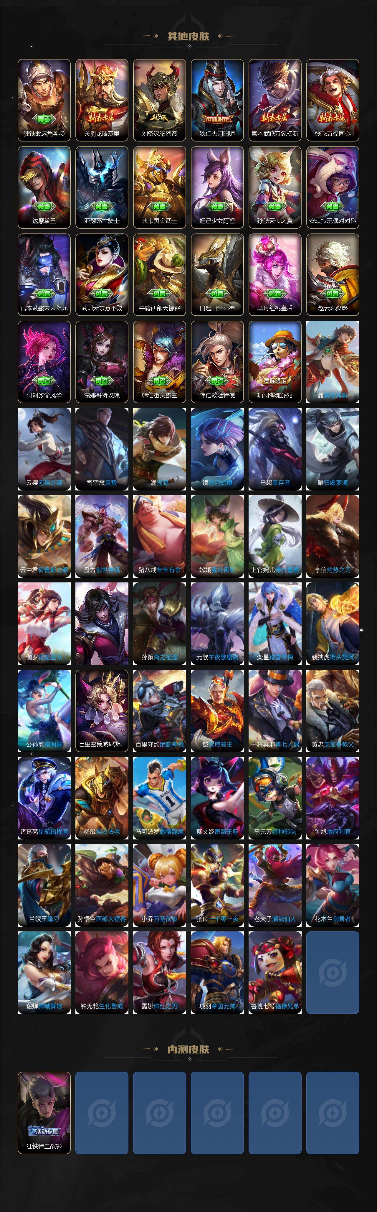 【限定皮肤】:大乔绒语心约,姜子牙天穹之誓,杨戬破阵退雄兵,狄仁杰阴阳师,赵云皇家上将,狄仁杰魔术师,达摩沙漠行僧,项羽海滩派对,李元芳匿光侦查者,百里玄策原初追逐者,裴擒虎李小龙,裴擒虎擒涛扼浪,云中君纤云弄巧,嫦娥拒霜思,西施玲珑珍味,鲁班大师探海日志,戈娅