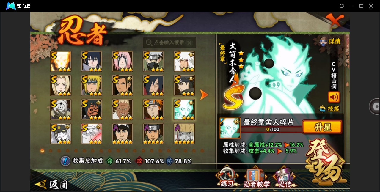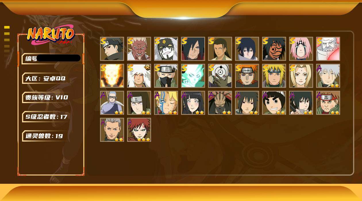 【编号42006可秒换绑】店长推荐特价处理精品号17S级忍者数-26A级忍者数【S级忍者】:宇智波斑「秽土转生·解」(3星),春野樱「忍界大战」(3星),艾「忍界大战」(3星),宇智波止水「须佐能乎」(3星),旗木卡卡西「须佐能乎」(3星),千手柱间「木叶创立」(3星),自来也「舞之豪杰」(3星),纲手(3星),波风水门(3星),神秘面具男「红夜之刃」(3星),漩涡鸣人「九喇嘛连结」(3星),佩恩「天道」(3星),宇智波佐助「永恒万花筒」(3星),宇智波斑 「白面具」(3星宇智波斑「白面具」),