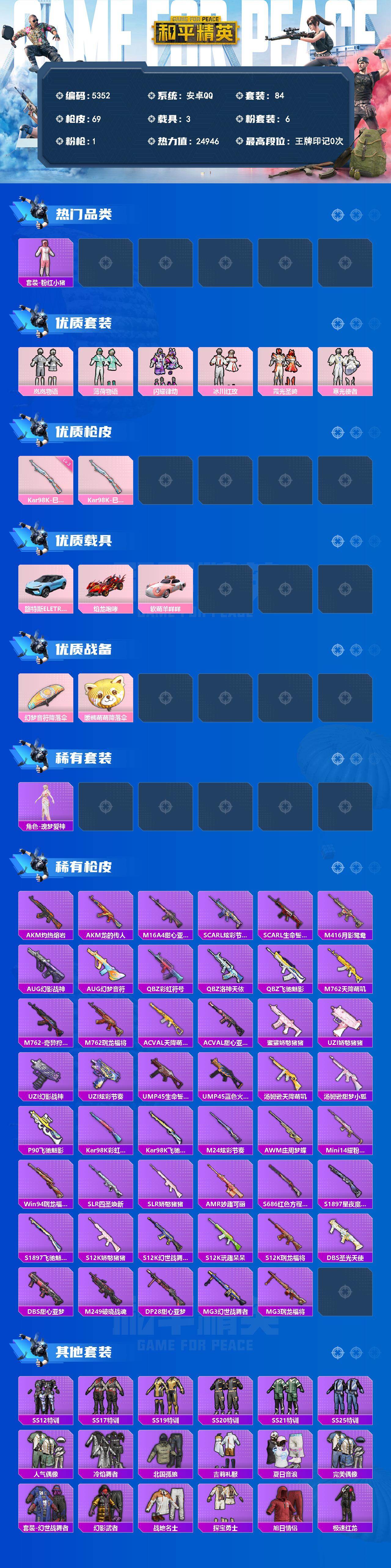 粉装6/粉枪1/载具3/套装84/枪皮69/热力值24946/历史最高段位:王牌印记0次/Lv:58/三级Kar98K-巳巳如意/套装-粉红小猪/岚岚物语/薄荷物语/闪耀律动/冰川红玫/霞光圣骑/寒光使者/路特斯ELETRE(冰川蓝)/焰龙咆哮/软萌羊咩咩/Kar98K-巳巳如意/幻梦音符降落伞/暖熊萌萌降落伞/角色-瑰梦爱神/AKM-灼热熔岩/AKM-龙的传人/M16A4-甜心亚梦/SCAR
