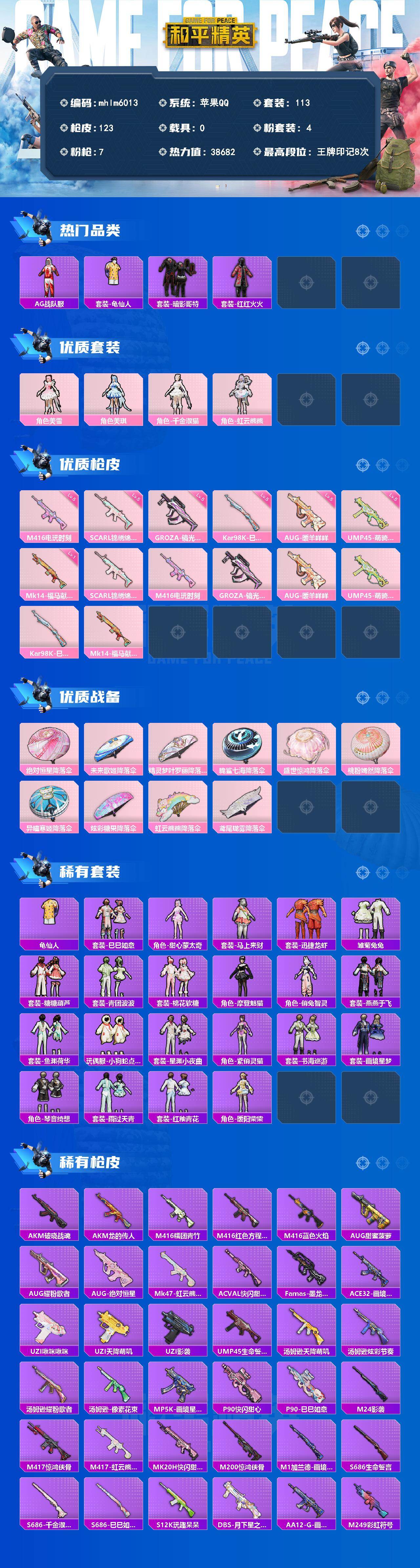 【mhlm6013】苹果 手Q-4粉装-7特效枪-0载具-0粉色飞行器-38682热力值-8王牌印记-113套装-123枪皮
