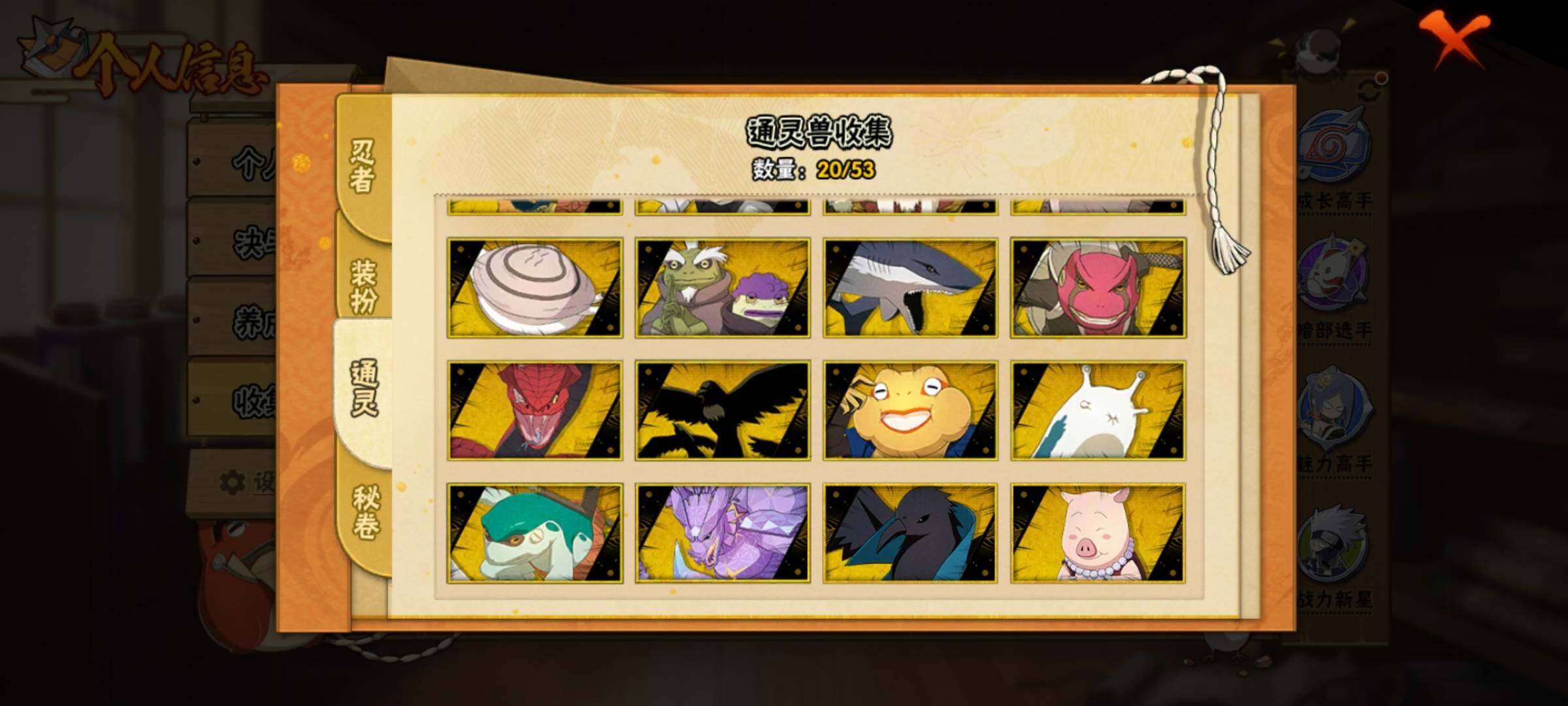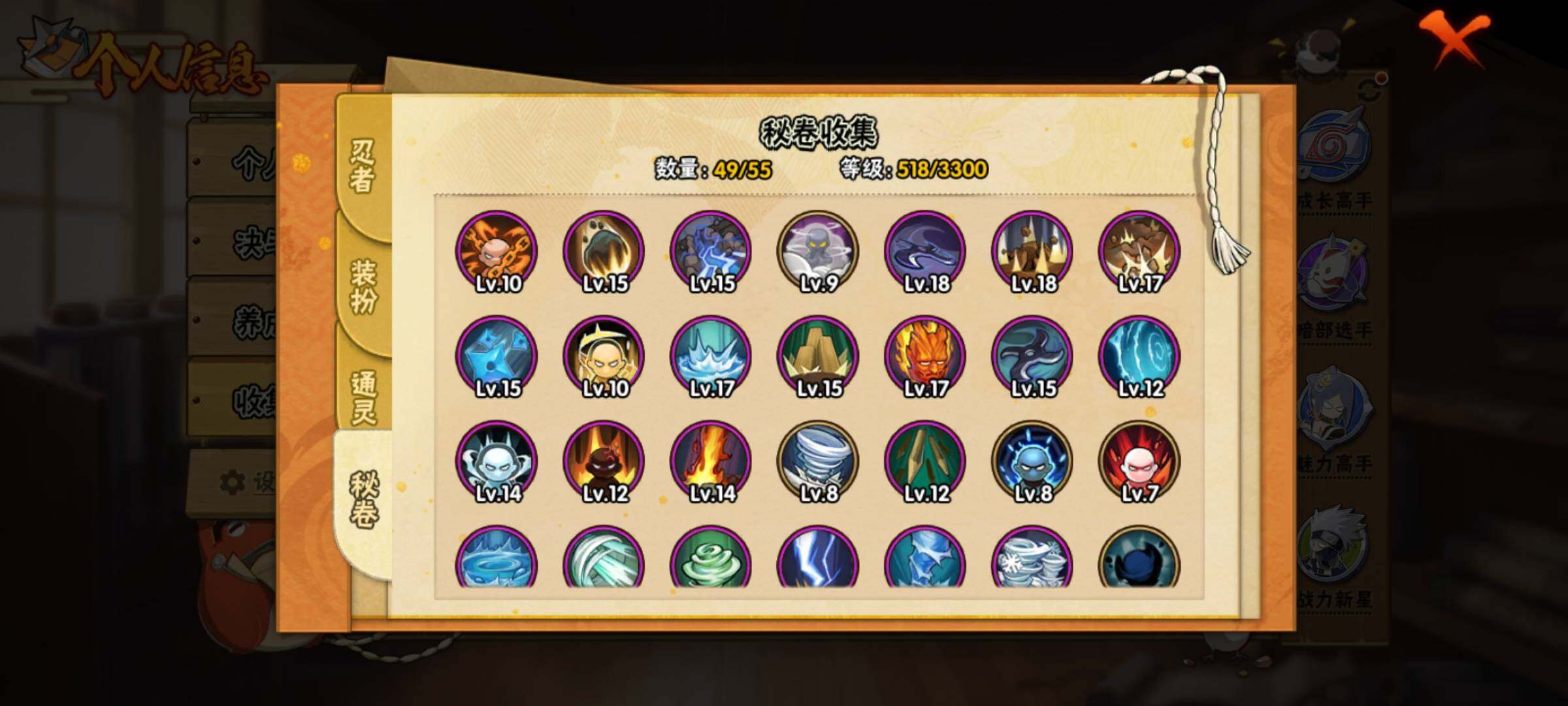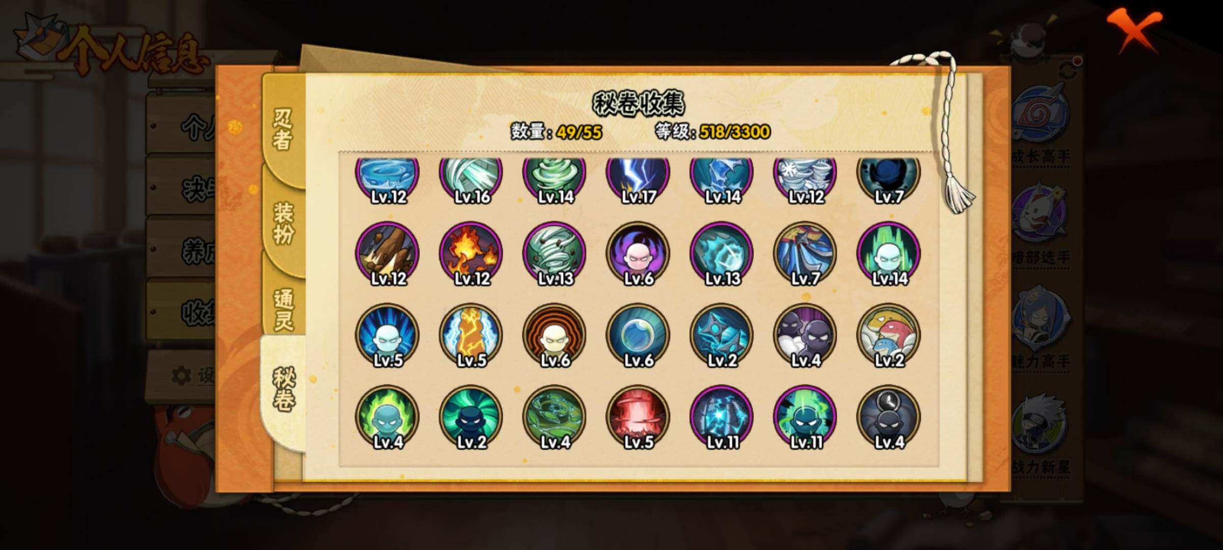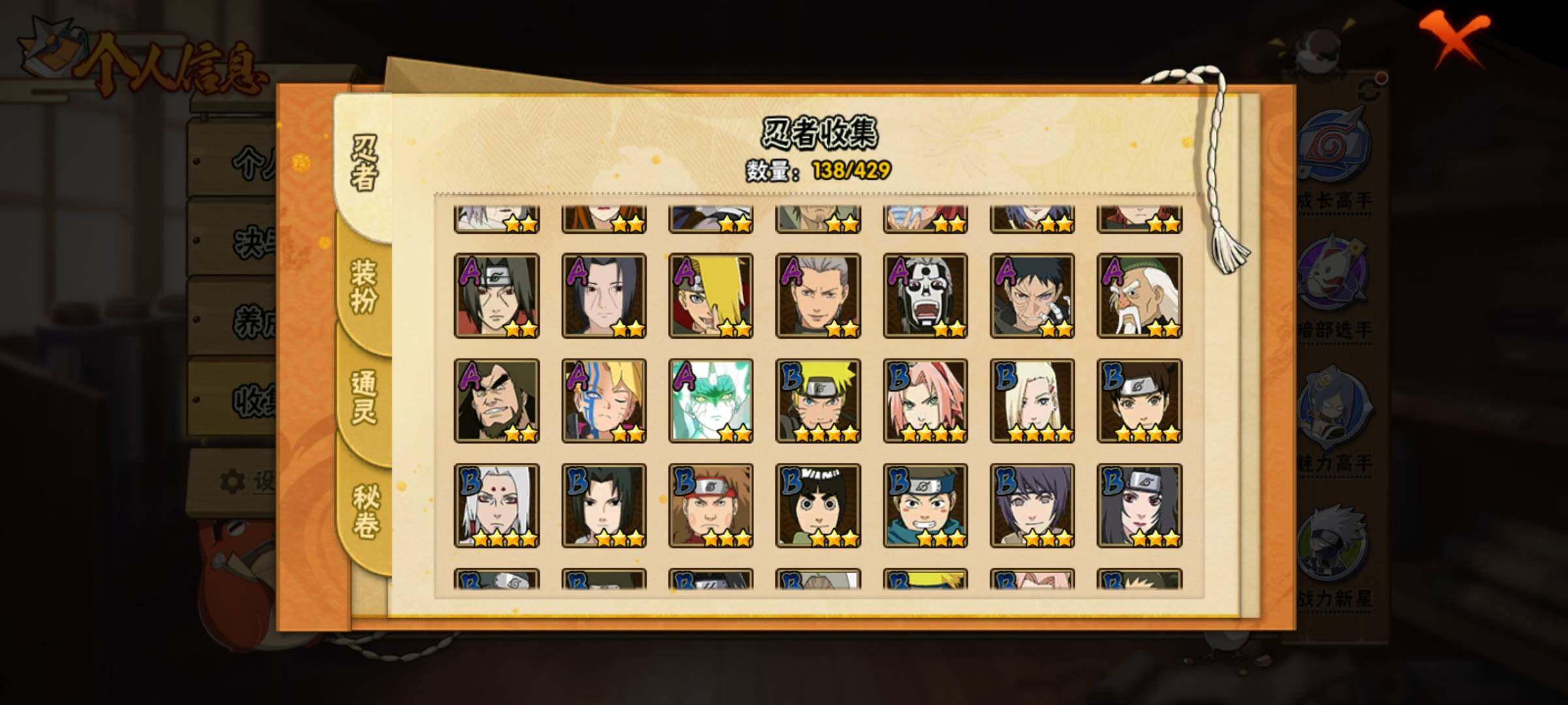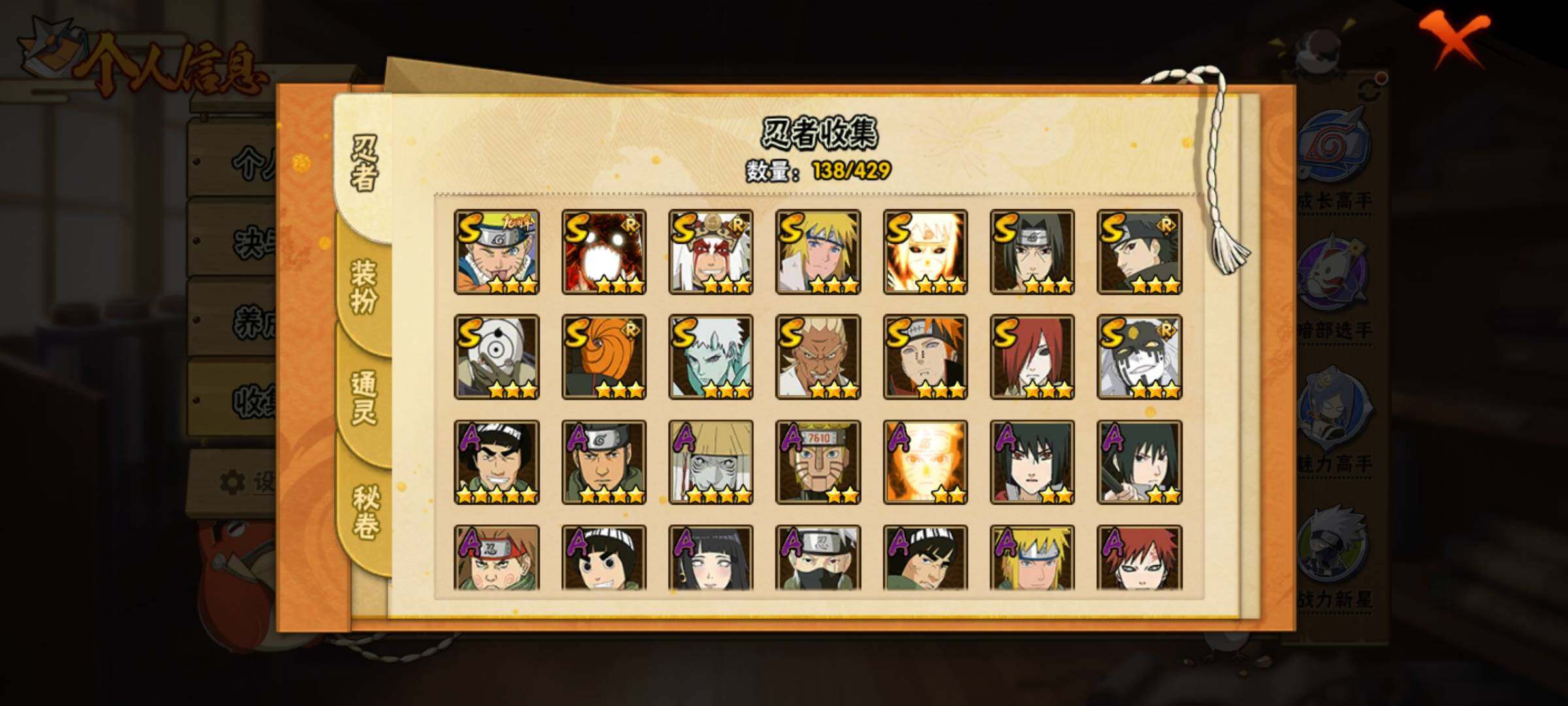 【S级忍者】:长门「秽土转生」(3星),艾「忍界大战」(3星),宇智波鼬「须佐能乎」(3星),宇智波止水「须佐能乎」(3星),自来也「舞之豪杰」(3星),波风水门(3星),佩恩「天道」(3星),宇智波斑 「白面具」(3星宇智波斑「白面具」),大筒木桃式(3星),漩涡鸣人「暴怒·第六尾」(3星),波风水门「九喇嘛连结」(3星),宇智波斑「五影会谈」(3星),漩涡鸣人·宇智波佐助(3星),宇智波带土「十尾人柱力」(3星)