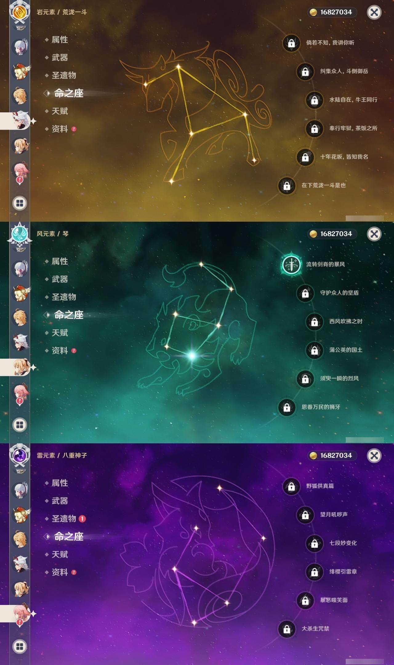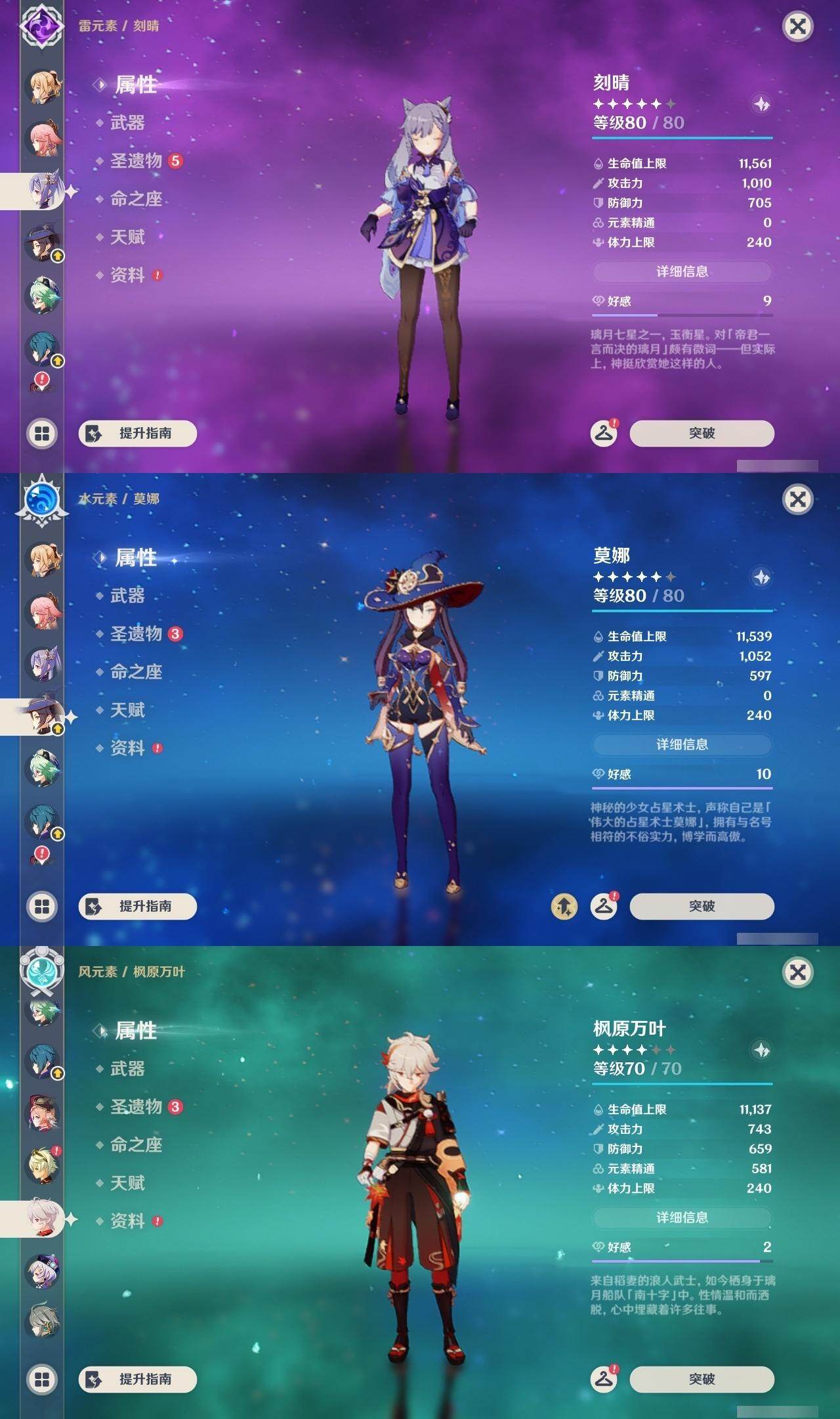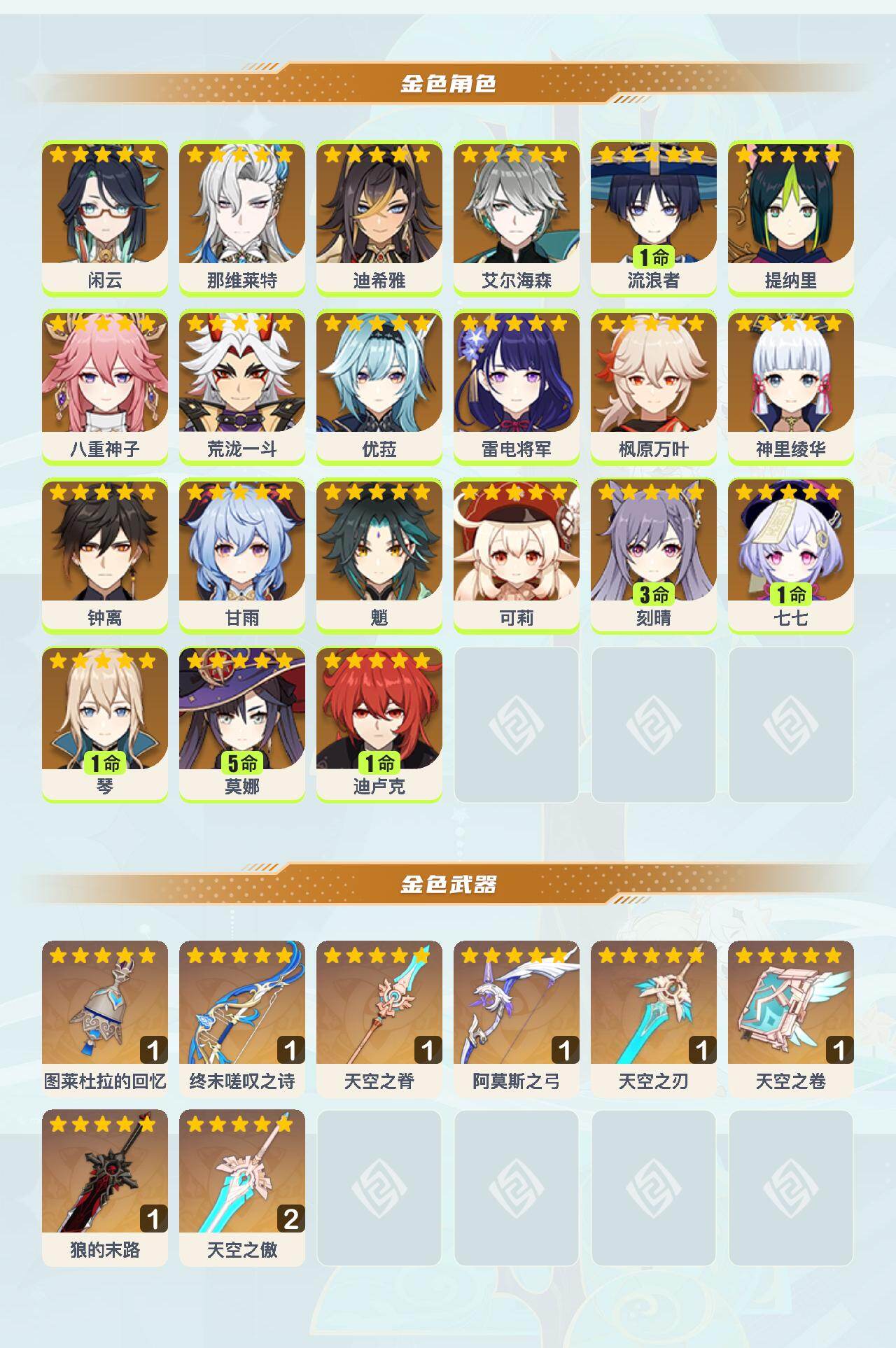 0命闲云,0命那维莱特,0命迪希雅,0命艾尔海森,1命流浪者,0命提纳里,0命八重神子,0命荒泷一斗,0命优菈,0命雷电将军,0命枫原万叶,0命神里绫华,0命钟离,0命甘雨,0命魈,0命可莉,3命刻晴,1命七七,1命琴,5命莫娜,1命迪卢克,精1图莱杜拉的回忆,精1终末嗟叹之诗,精1天空之脊,精1阿莫斯之弓,精1天空之刃,精1天空之卷,精1狼的