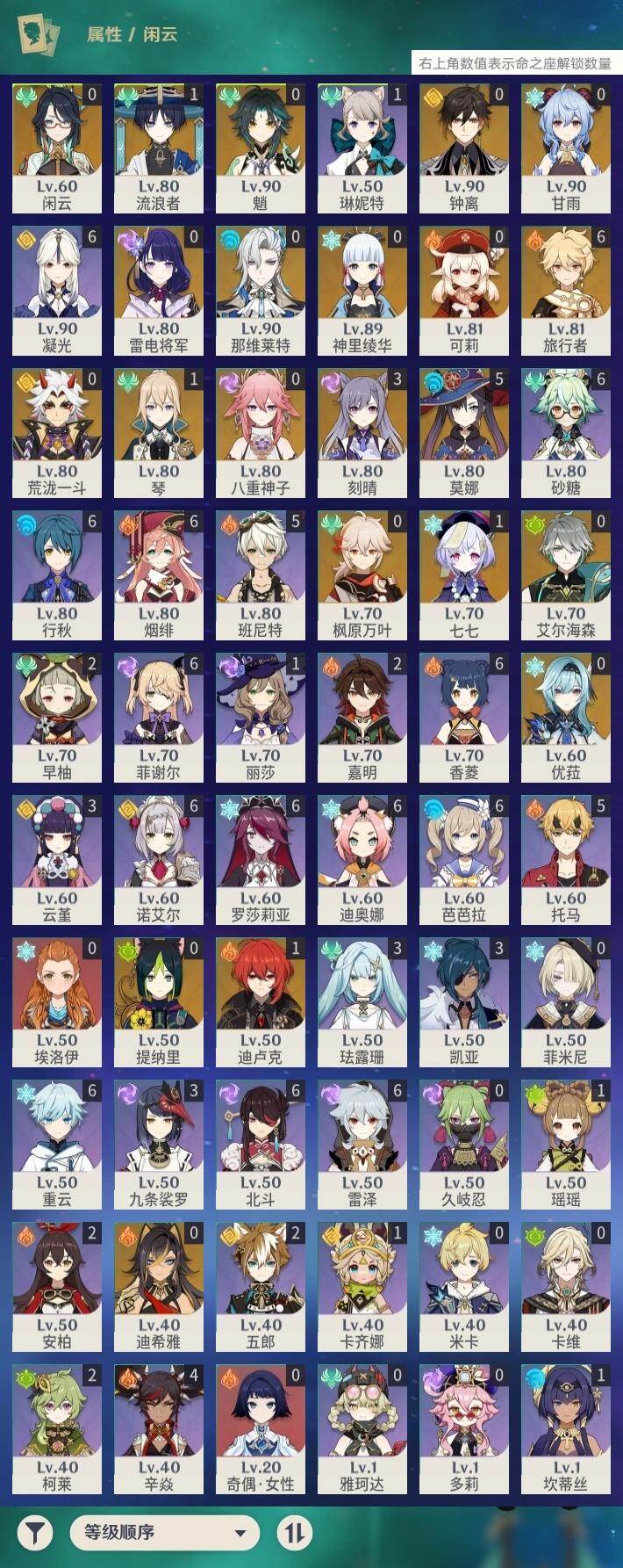 58级/42黄/男主/21个五星角色/8个五星武器0命闲云,0命那维莱特,0
