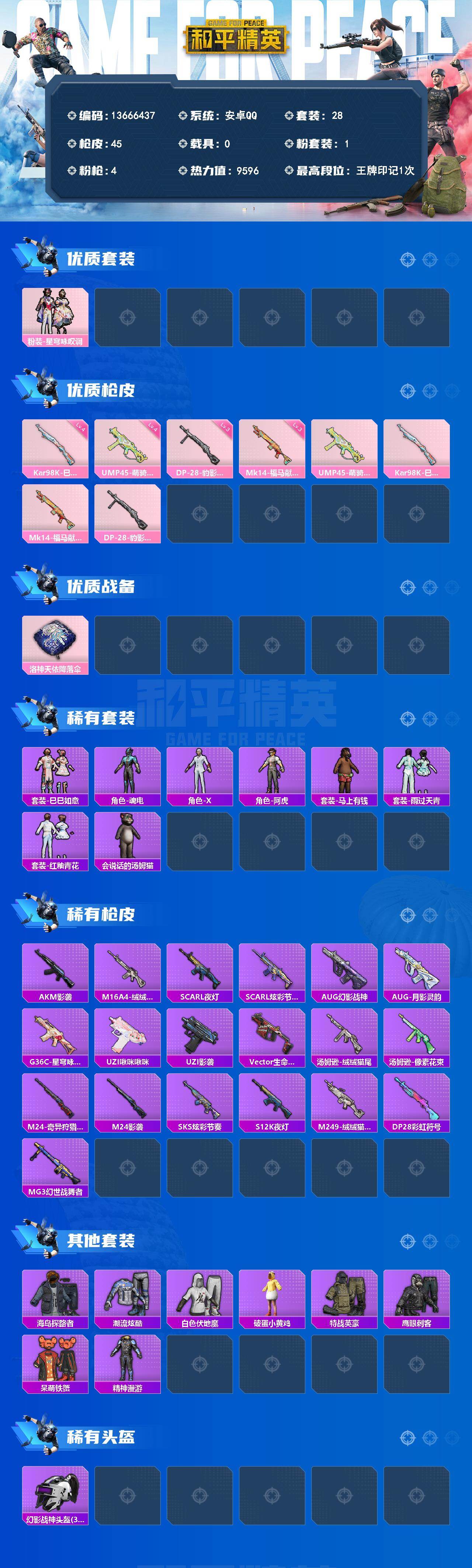 28套装/枪械4/装备27/战备25/王牌印记1/热力值9596/四级UMP4