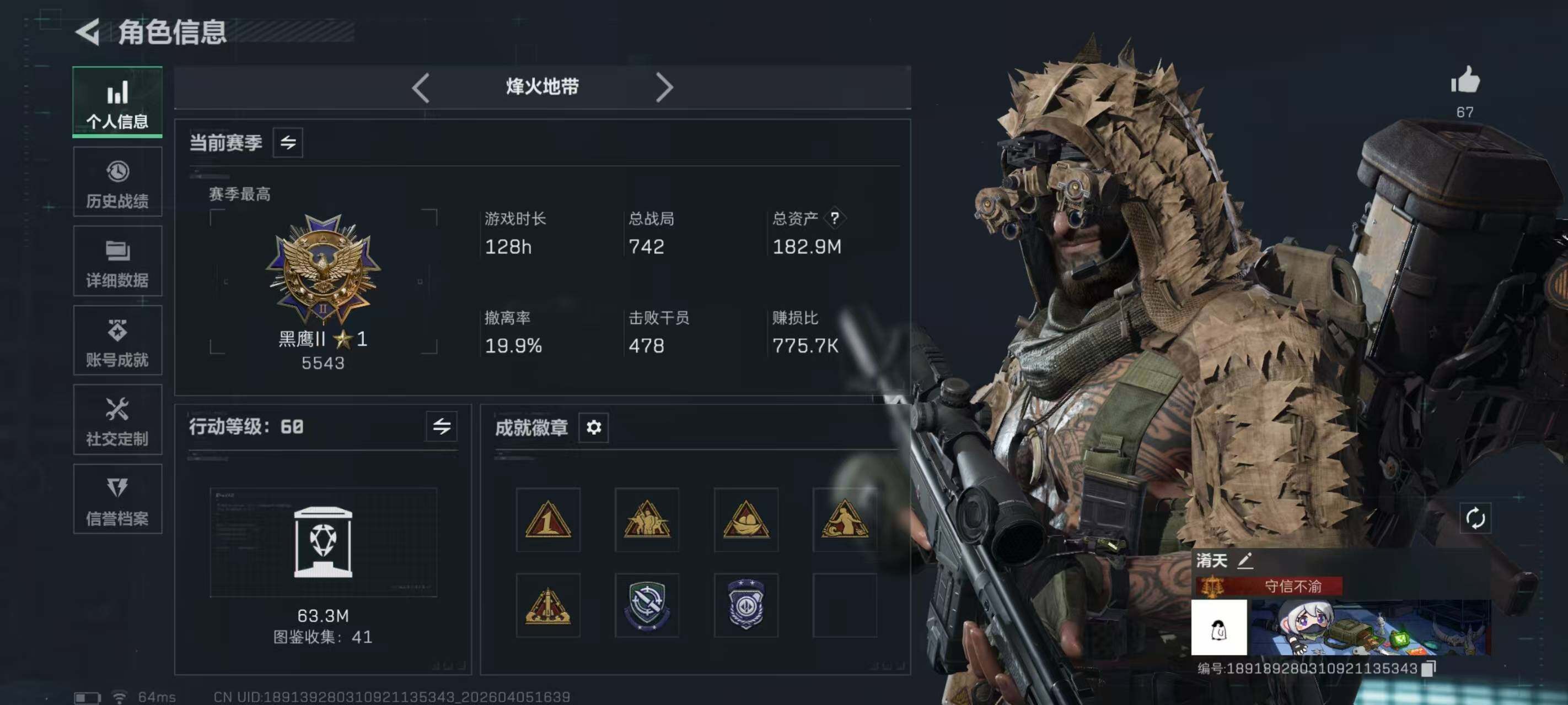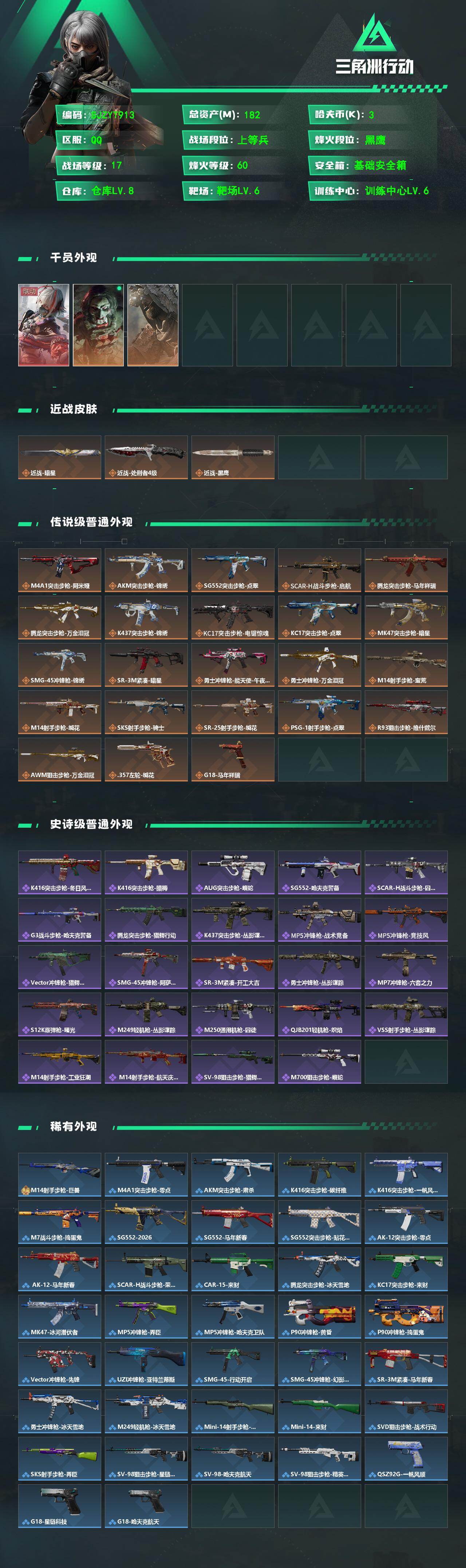 【SJZYT913】总资产(M):182M/哈夫币(K):3K/哈夫币(K):3K/传说枪皮数:23/全面战场等级:17_段位:上等兵/烽火地带等级:60_段位:黑鹰/骇爪-维什戴尔/红狼-电锯惊魂/乌鲁鲁-荒原猎手/近战-暗星/近战-处刑者4级/近战-黑鹰/M4A1突击步枪-阿米娅/AKM突击步枪-锦绣/SG552突击步枪-点翠/SCAR-H战斗步枪-启航/腾龙突击步枪-马年祥瑞/腾龙突击步枪-万金泪冠/K437突击步枪-锦绣/KC17突击步枪-电锯惊魂/KC17突击步枪-点翠/MK47突击步