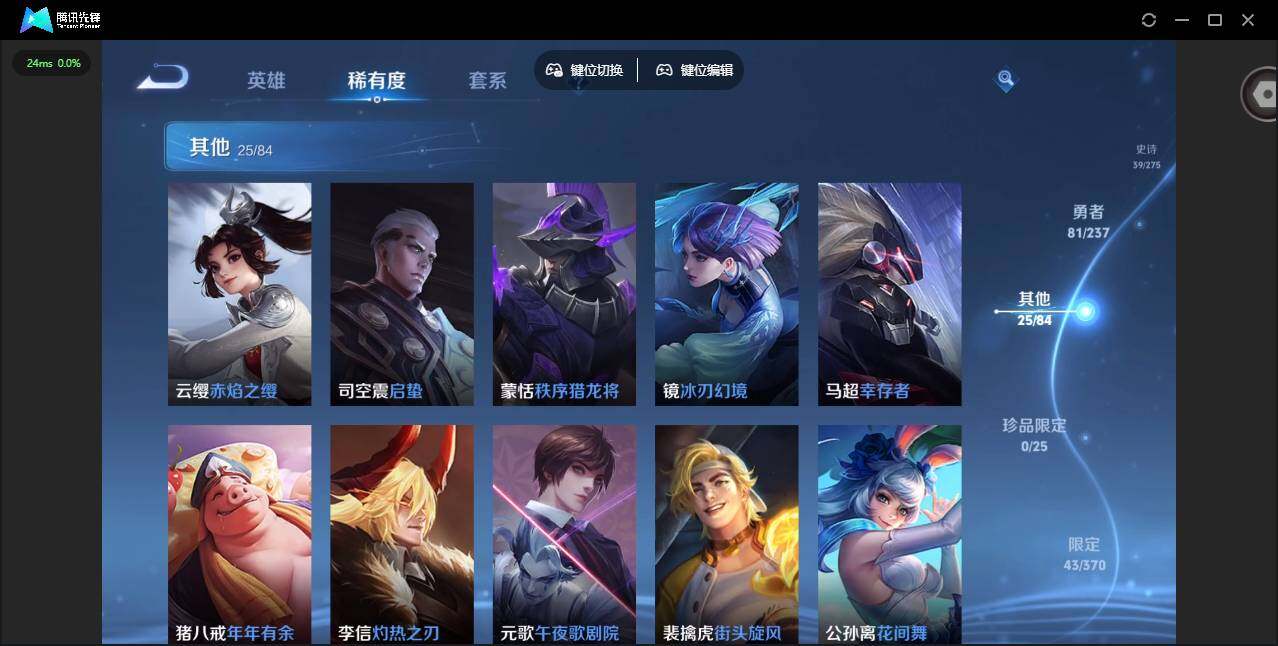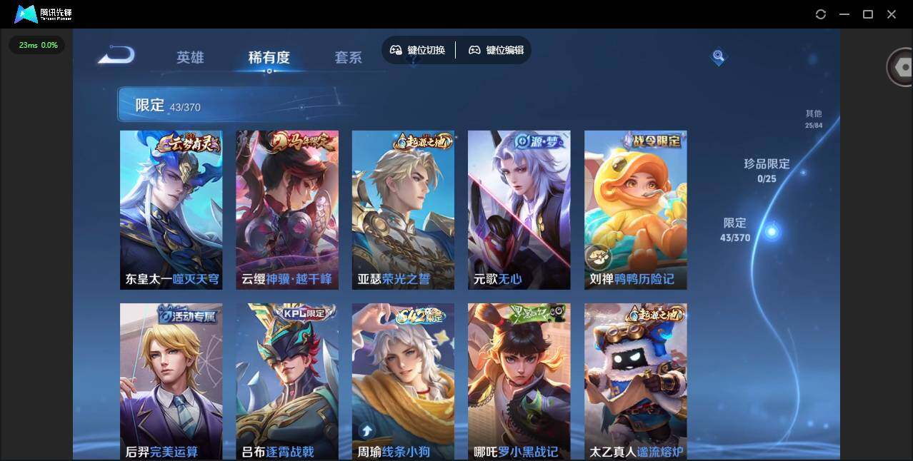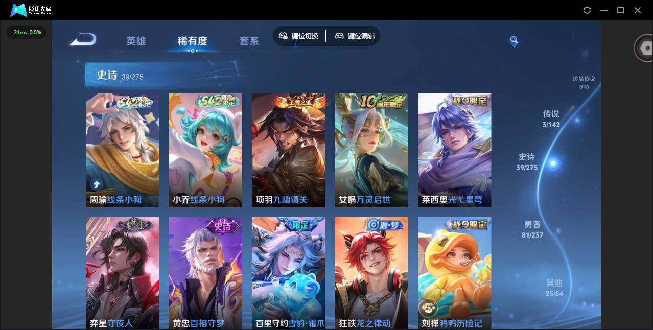 实名: 可修改 贵族等级: V5 英雄数: 116 皮肤数: 148 星传说: 幽冥之眼 传说皮: 地狱之眼,神骥·越千峰 限定皮: 鸣野蒿,逐霄战戟