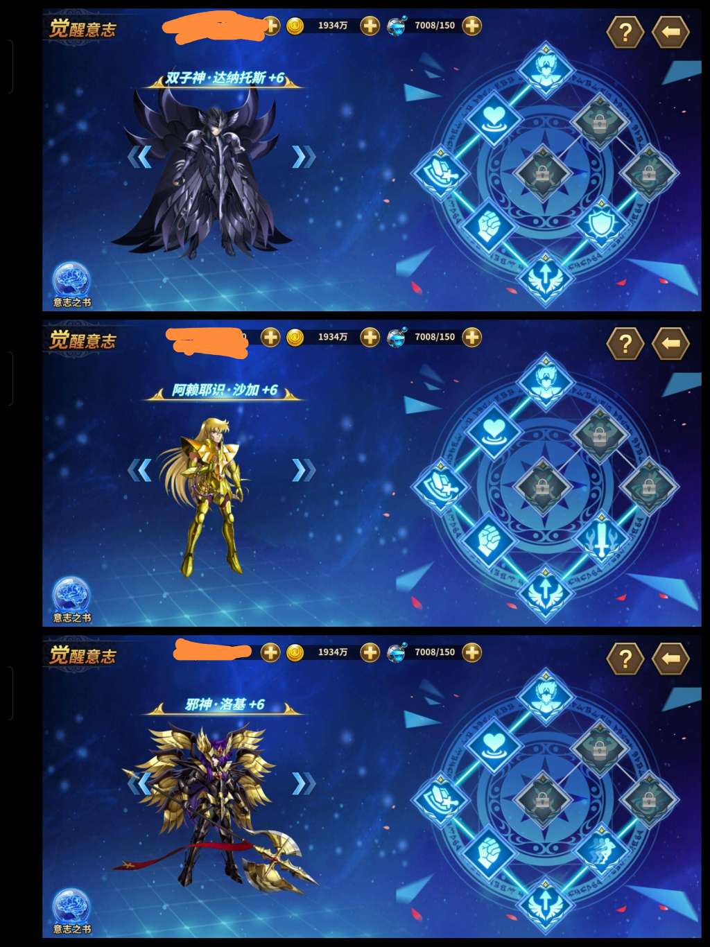 白羊26区人多!六觉死神邪神赖沙。基础多数满,三突红卡橙卡一堆,彩卡有。多数人物都是觉醒的。17万钻