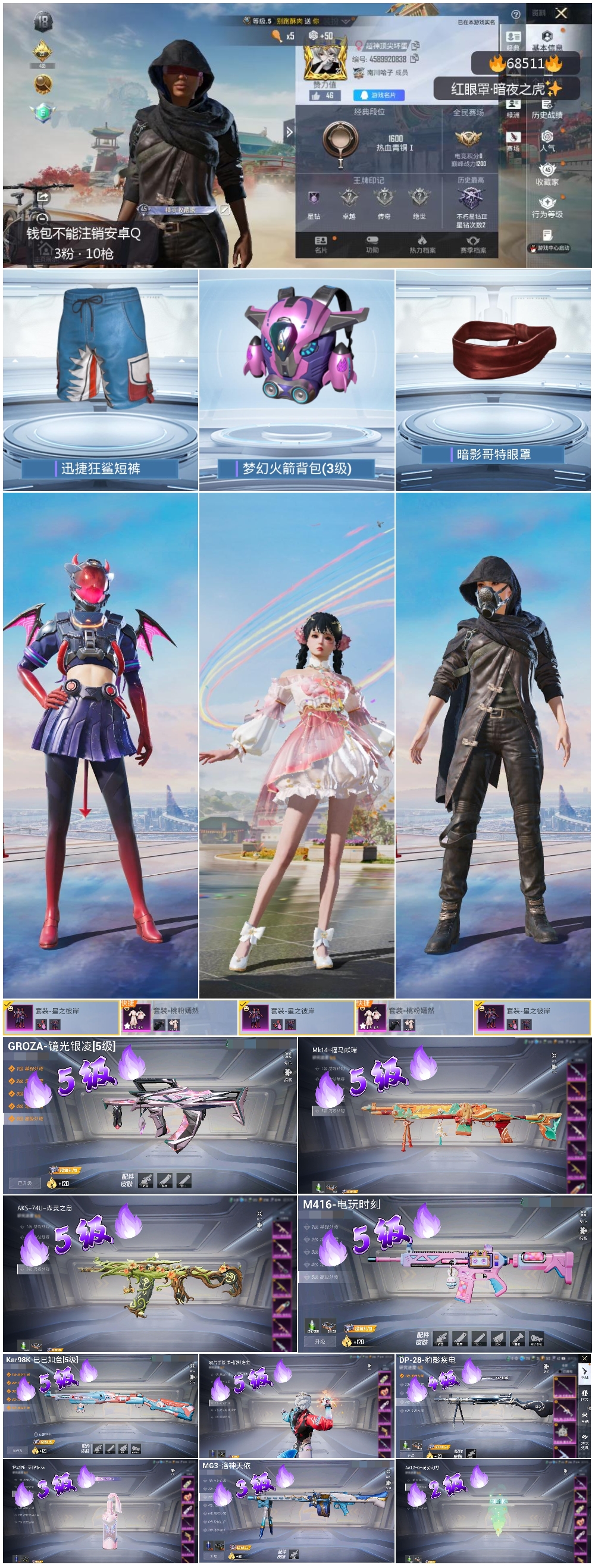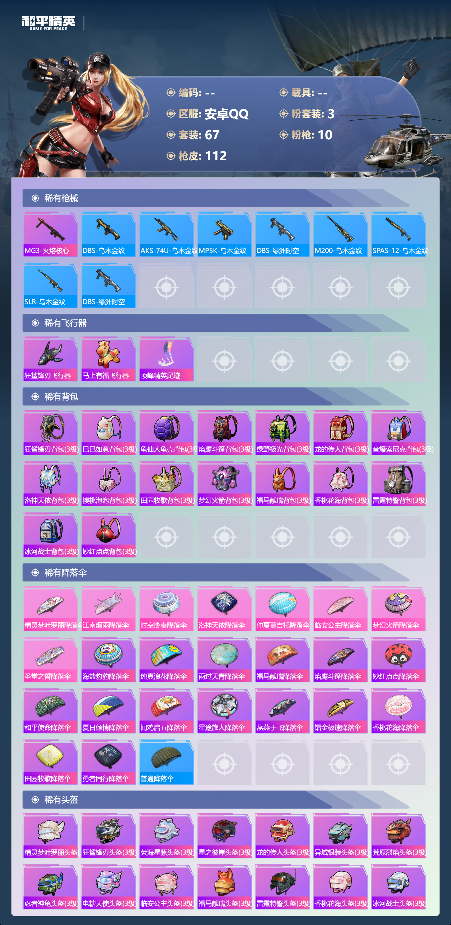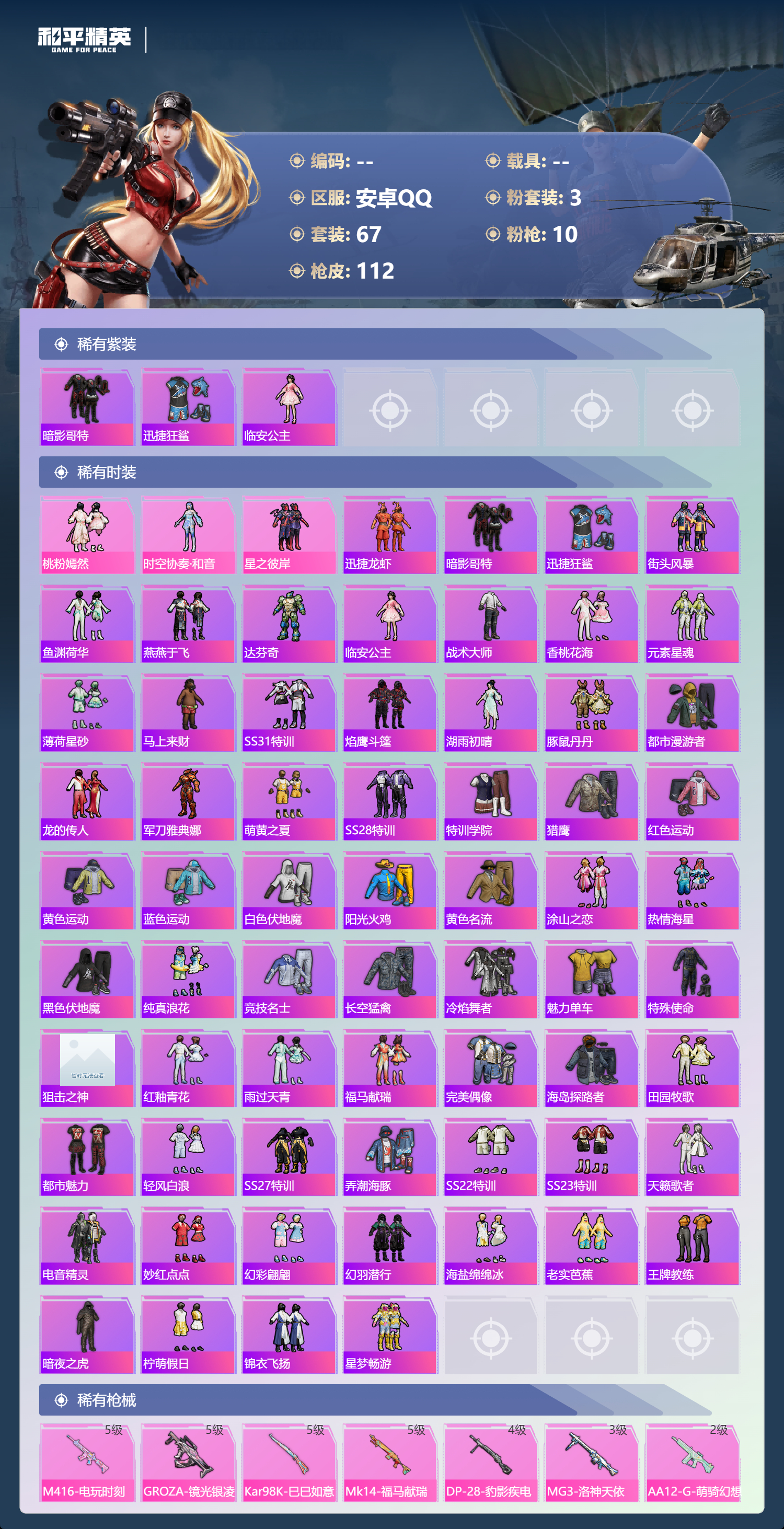 hs68511 安卓手Q-0王牌印记-3粉装-10特效枪-32294热力值-67套装-112枪皮