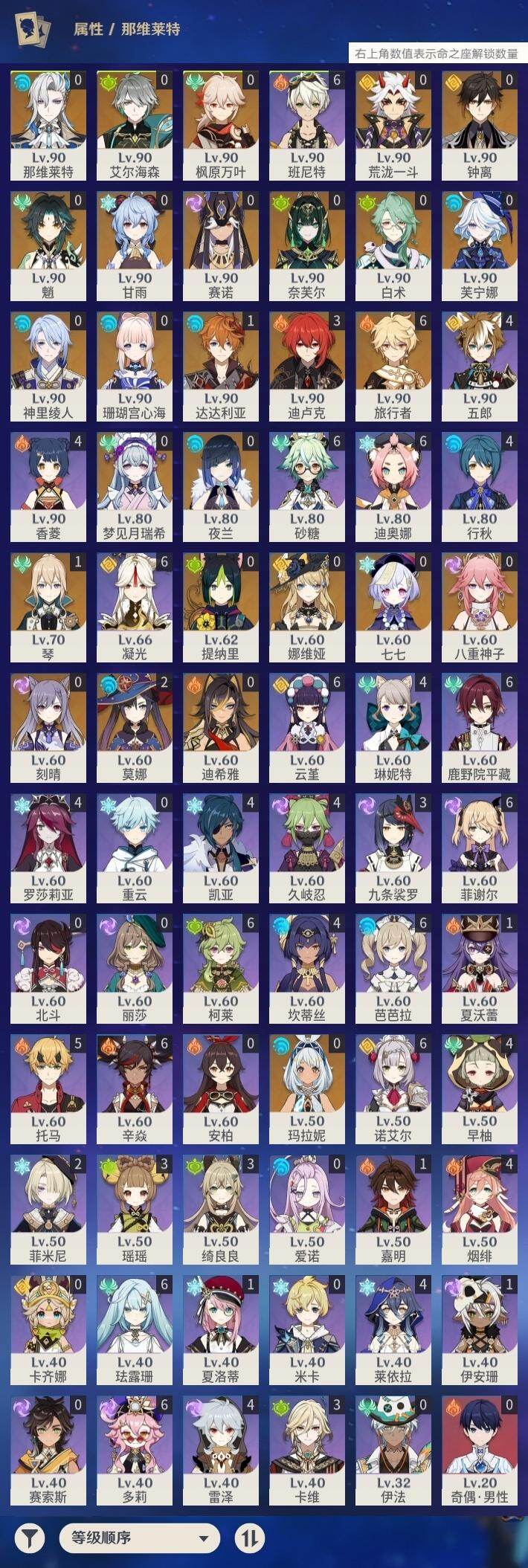 0命娜维娅,0命芙宁娜,0命那维莱特,0命白术,0命迪希雅,0命艾尔海森,0命赛诺,0命提纳里,0命夜兰,0命神里绫人,0命八重神子,0命荒泷一斗,0命枫原万叶,0命钟离,0命甘雨,0命魈,1命达达利亚,0命珊瑚宫心海,0命刻晴,0命七七,1命琴,2命莫娜,3命迪卢克,0命玛拉妮,0命梦见月瑞希,0命奈芙尔,精1裁叶萃光,精1波乱月白经津,精1赤角石溃杵,精1四风原典,精1和璞鸢,精1天空之脊,精1贯虹之槊,精1天空之翼,精2天空之刃,精1斫