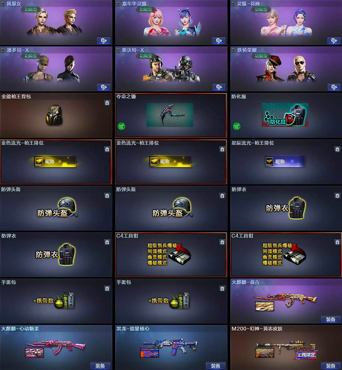 【皮肤】:M200-幻神-黄忠皮肤,火麒麟-盘古,火麒麟-心动糖果,黑龙-能量核心
