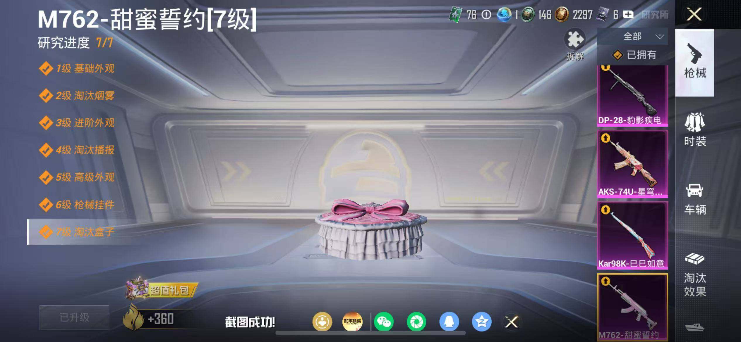 【粉色枪皮等级】:M762-甜蜜誓约(七级),AKS-