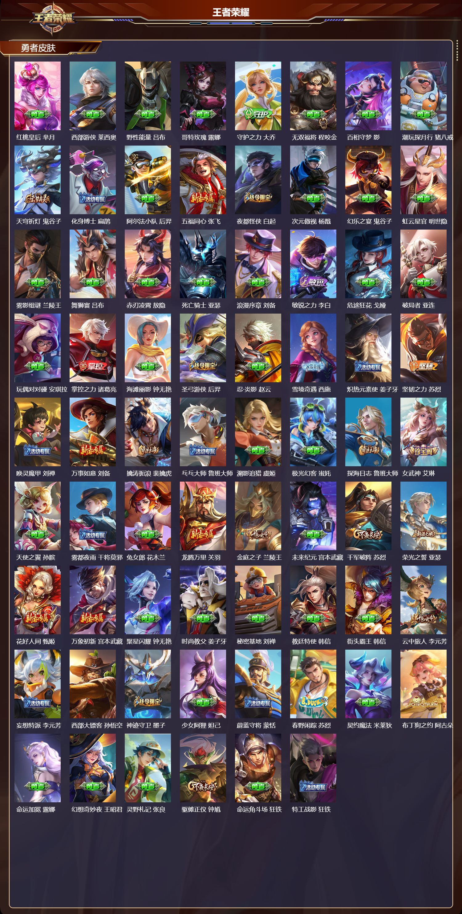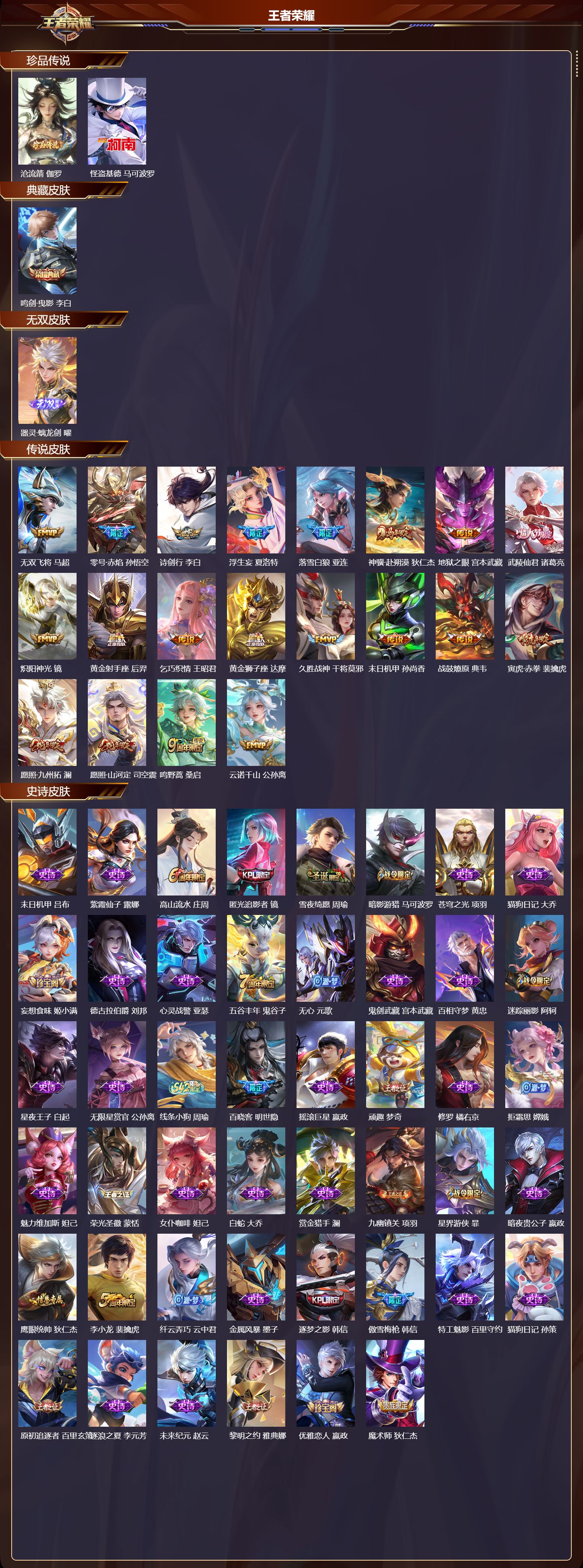 至尊星耀/290皮肤/129英雄/1典藏/0珍品无双/1无双/2珍品传说/20传说/84史诗/9稀有英雄