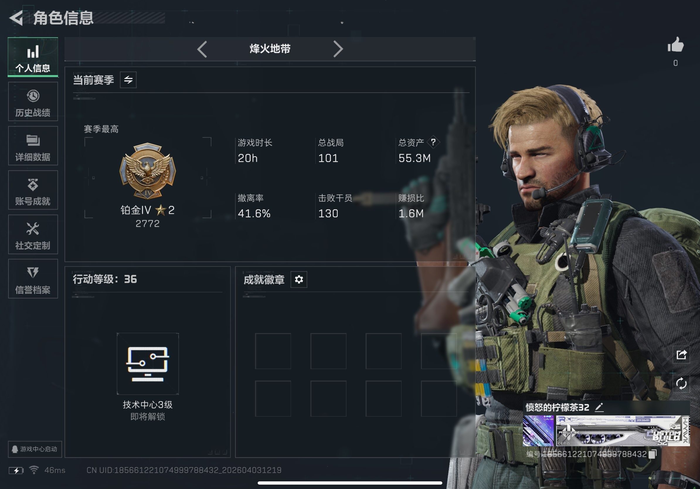 【特价出售/店主推荐】55m总资产-18302k哈夫币-36烽火等级-铂金-1战场等级-无军衔