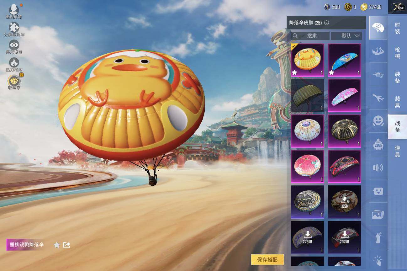 【粉色降落伞】:星之彼岸降落伞,垂柳戏鸭降落伞,旋转彩虹降落伞,暗夜鎏金降落伞,音爆索尼克降落伞,智耀战神降落伞,炫彩糖果降落伞