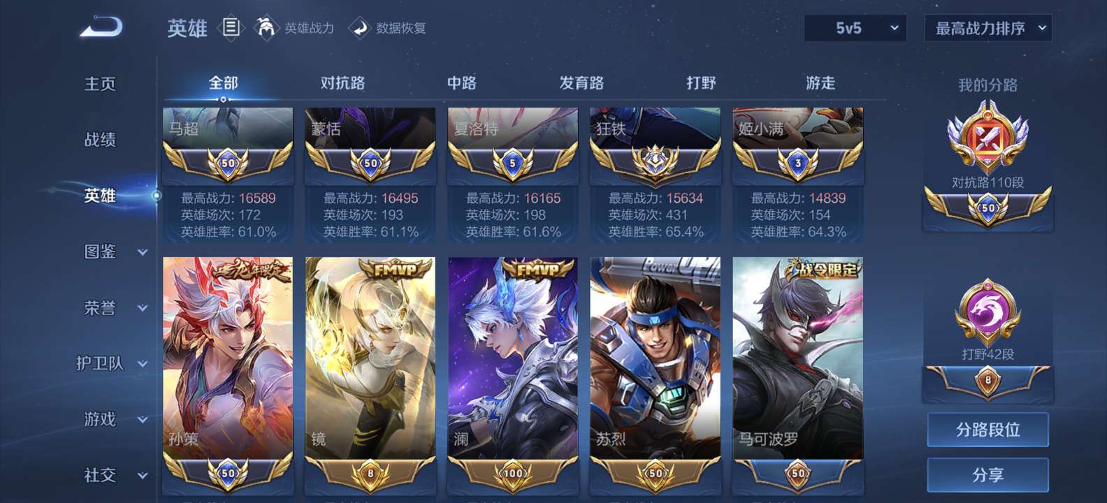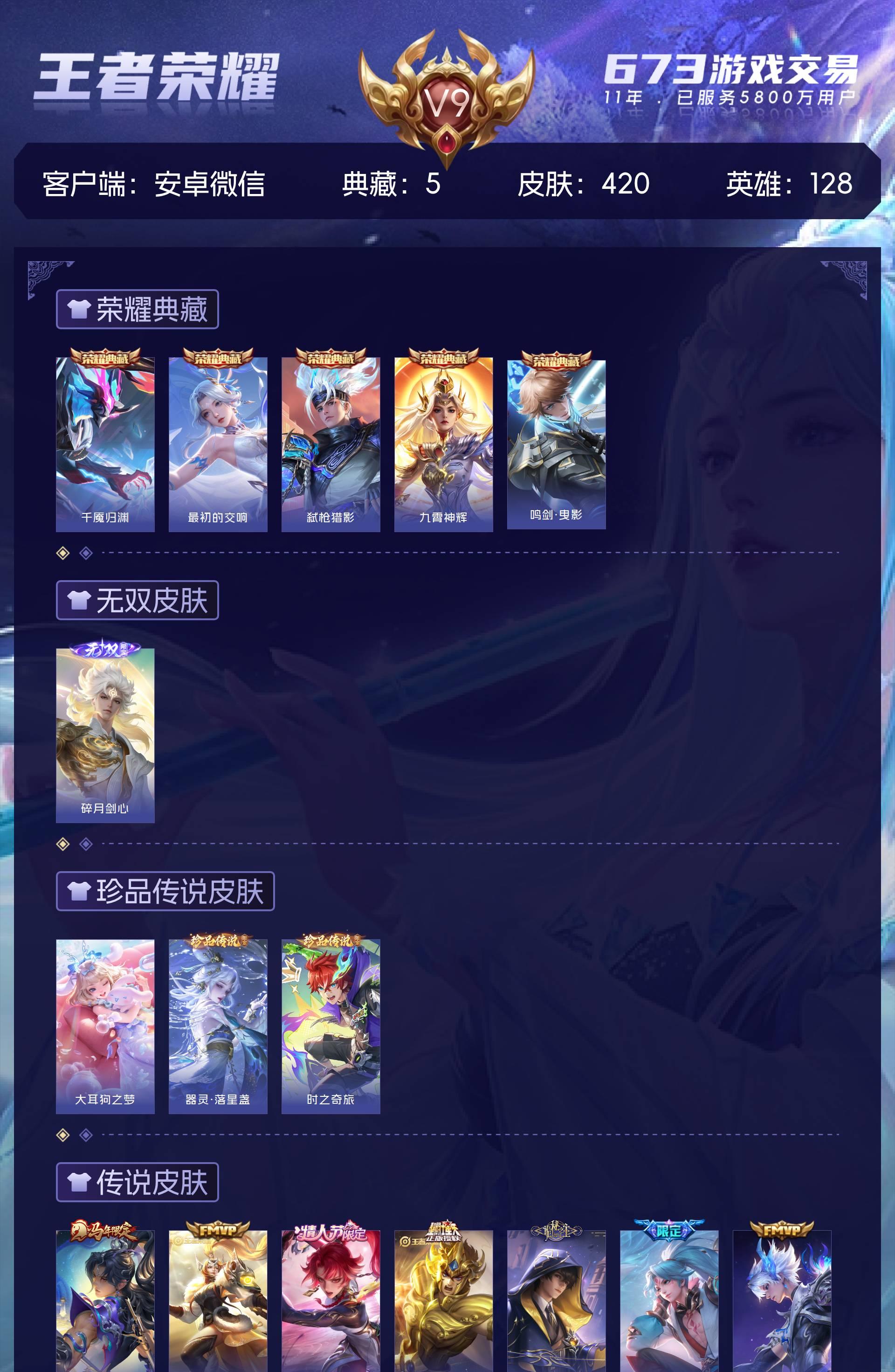 V9 皮肤420 英雄128 至尊星耀 荣耀典藏5 无双皮肤1 珍品传说3 星传说1 传说42