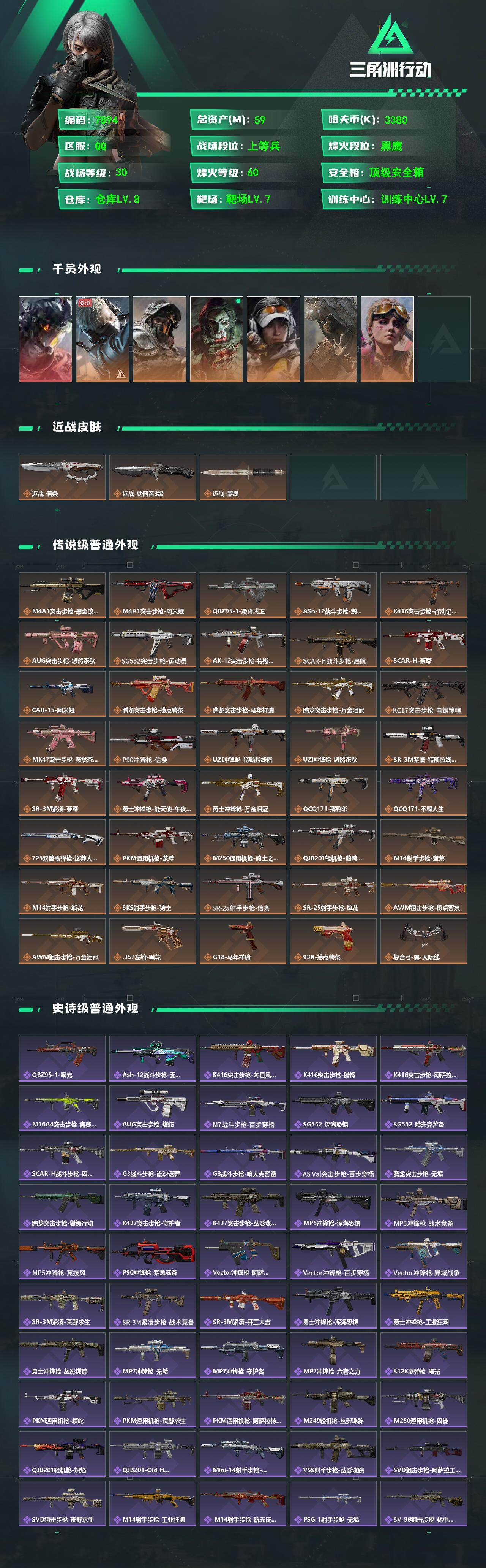 {特价出售}等级:60总资产:59.6M 纯币3368k 隐藏挂饰:统统拿走1s 红皮:凌霄戍卫无题密令 刀皮:信条 砖皮: 特勤处:仓库8,训练7,靶场7