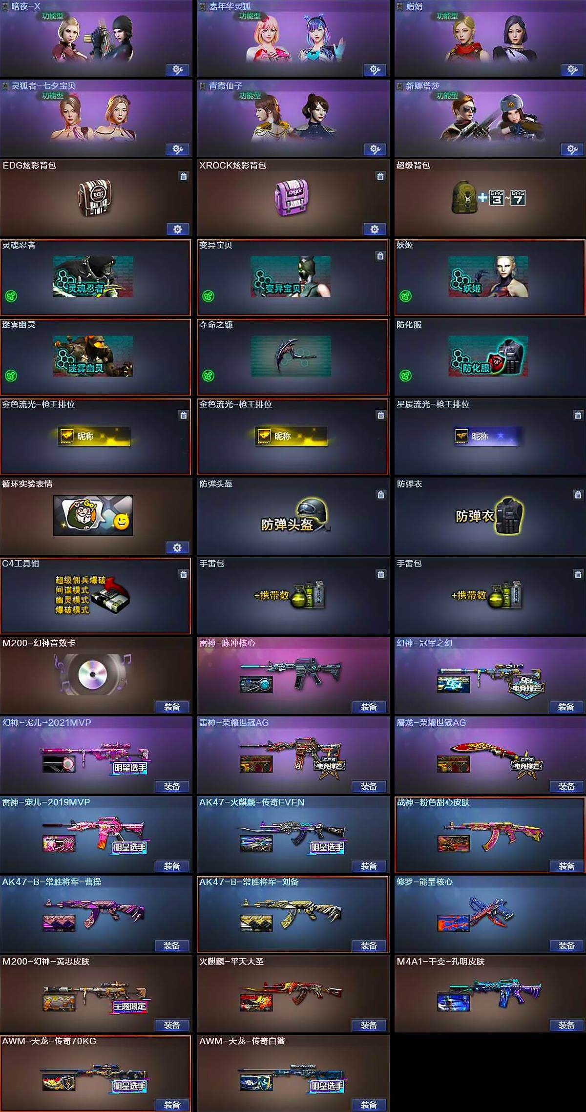 安徽一区-31V-5王者-0炫金【角色】:王者零-传说之路,青霞仙子【热门武器】:M200-幻神,荣耀世冠-柯尔特,荣耀世冠-雷神,荣耀世冠-龙啸,加特林-炼狱,金色蔷薇-空【王者炫金武器】:王者之势【稀有皮肤】:屠龙-荣耀世冠AG,AK47-火麒麟-传奇EVEN,幻神-冠军之幻,幻神-宠儿-2021MVP,M200-幻神-黄忠皮肤,雷神-宠儿-2019MVP,雷神-荣耀世冠AG,黑骑士-摸金校尉,雷神-赛博朋克,火麒麟-平天大圣,AWM-天龙-传奇70KG,AWM-天龙-传奇白鲨,AWM-CF