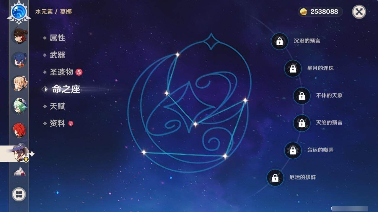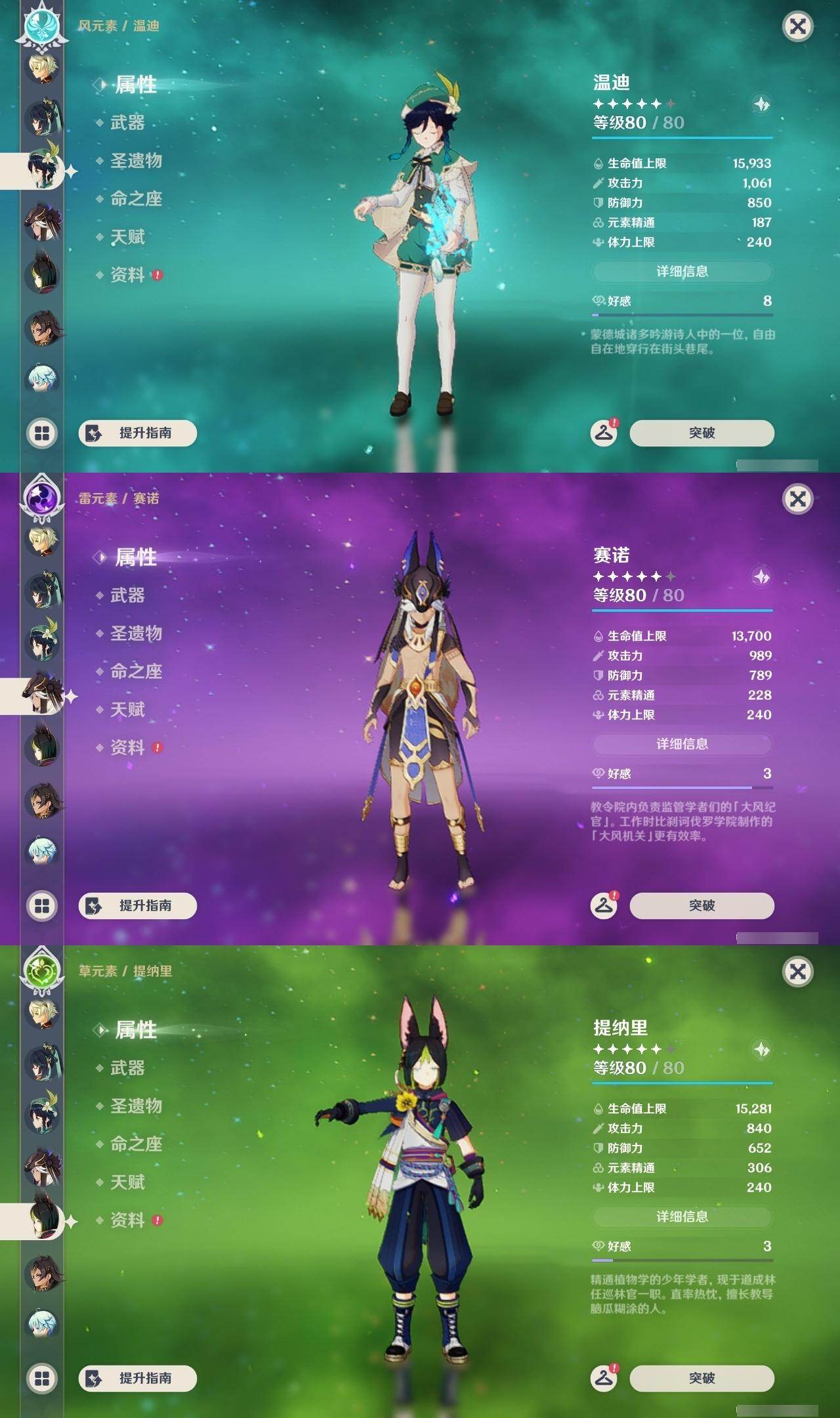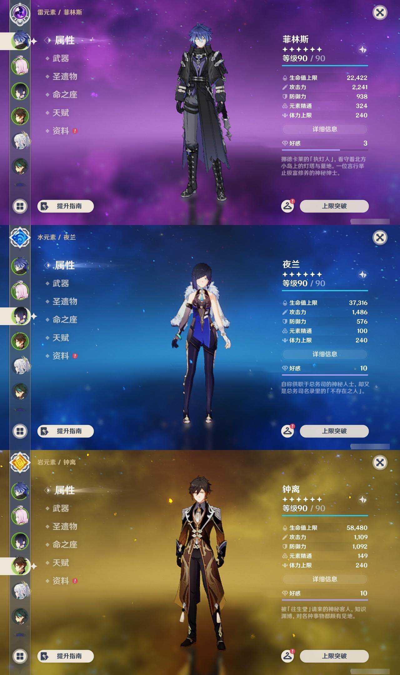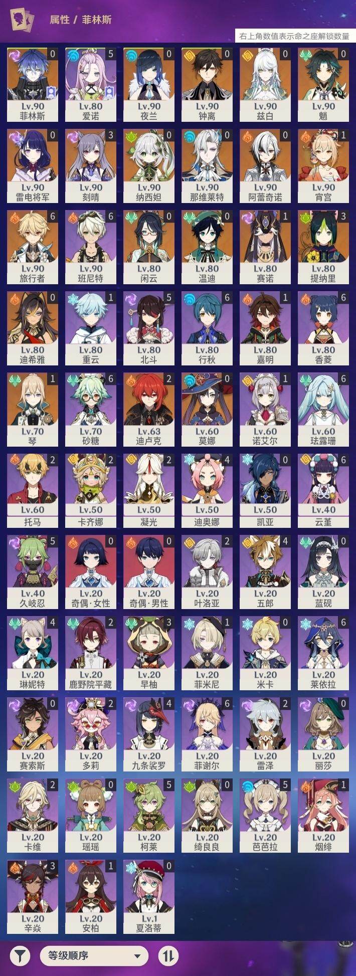 0命阿蕾奇诺,0命闲云,0命那维莱特,0命迪希雅,0命纳西妲,1命赛诺,3命提纳里,0命夜兰,0命雷电将军,0命钟离,0命魈,1命宵宫,0命温迪,3命刻晴,1命琴,0命莫娜,2命迪卢克,0命菲林斯,0命兹白,精1万世流涌大典,精1和璞鸢,精1天空之翼,精1阿莫斯之弓