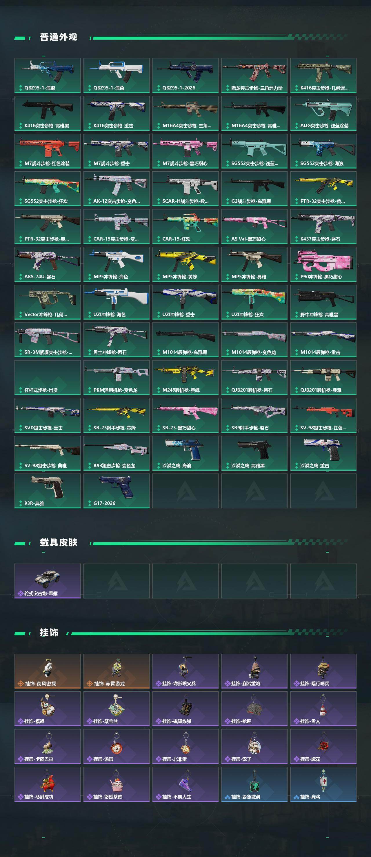【传说外观】:K416突击步枪-行动记录,AUG突击步枪-悠然茶歇,SG552突击步枪-运动员,腾龙突击步枪-马年祥瑞,KC17突击步枪-电锯惊魂,MK47突击步枪-悠然茶歇,UZI冲锋枪-悠然茶歇,SR-3M紧凑突击步枪-荼蘼,QCQ171冲锋枪-不羁人生,M14射手步枪-蛮荒,M14射手步枪-缄花