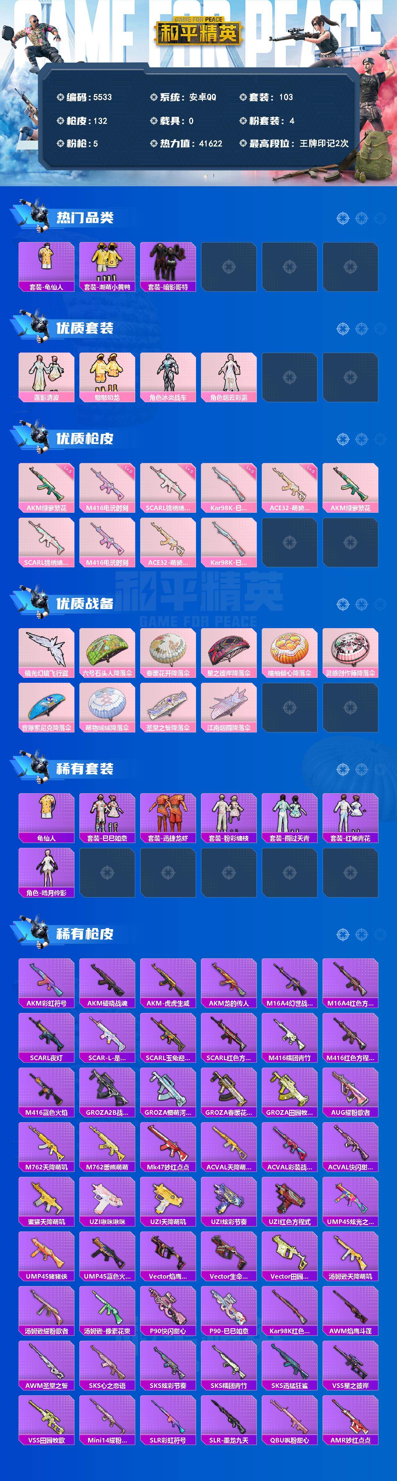 安卓 手Q-4粉装-5特效枪-0载具-1粉色飞行器-41622热力值-2王牌印记-103套装-132枪皮