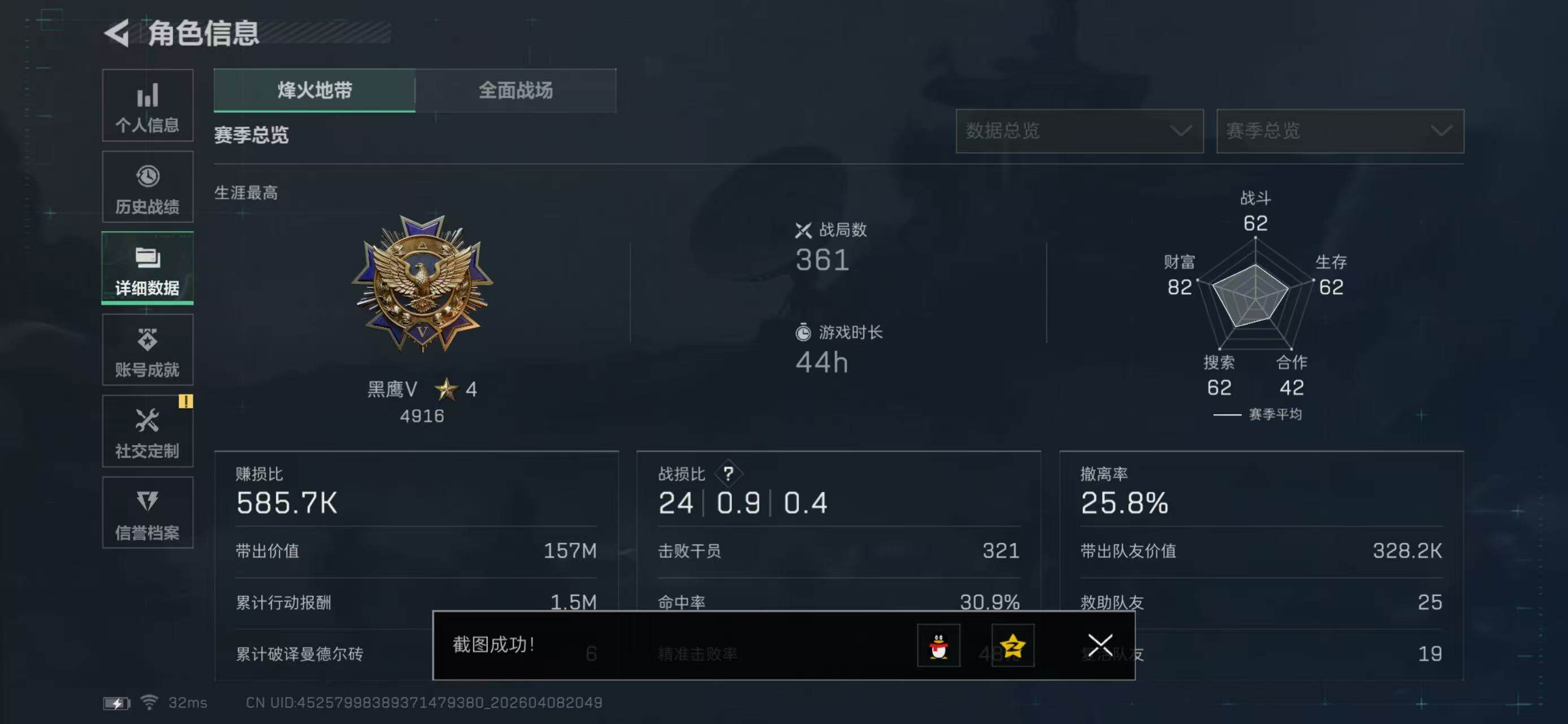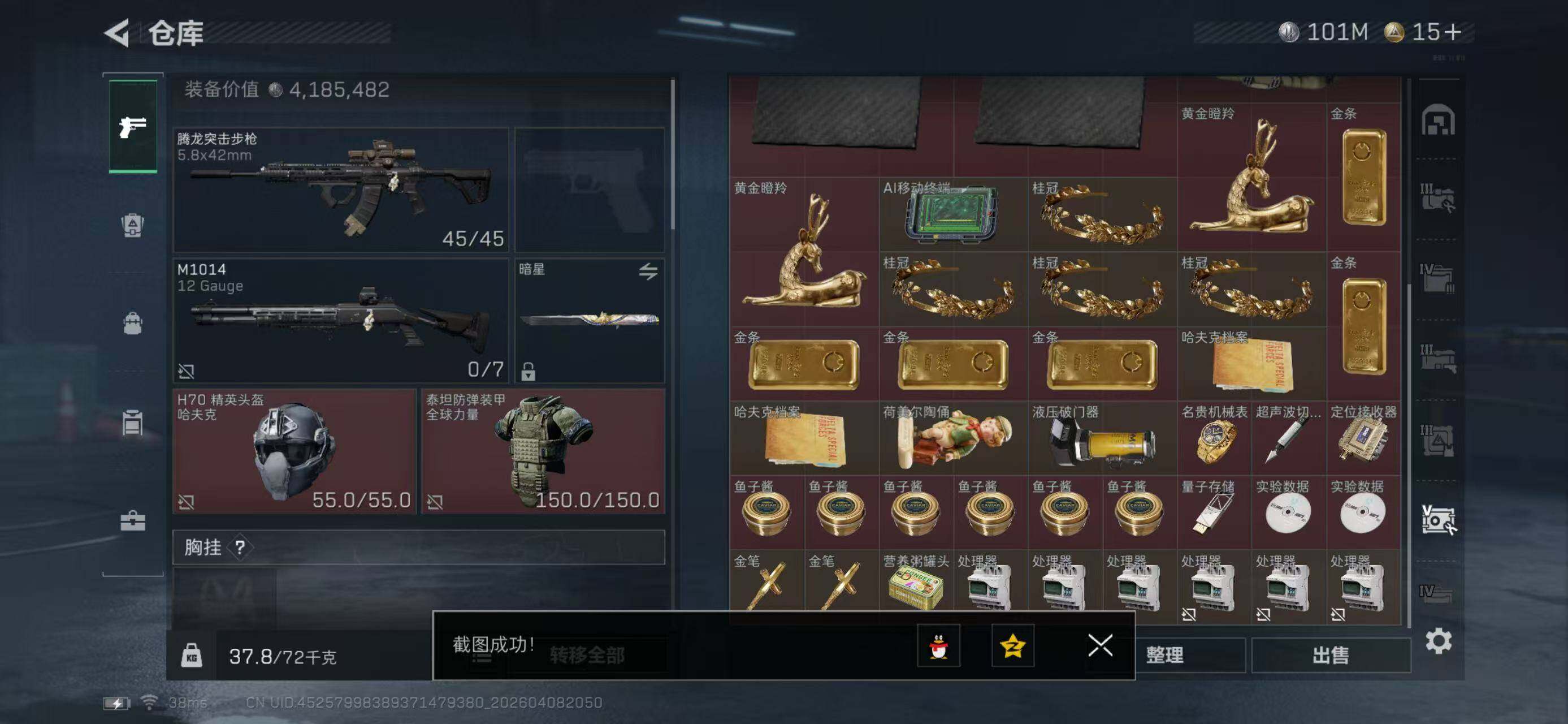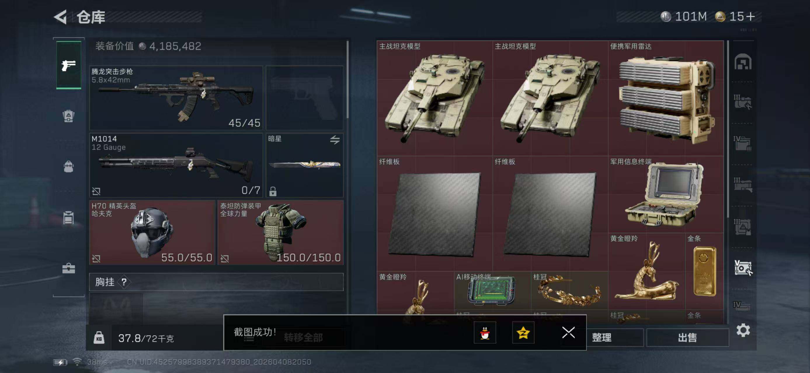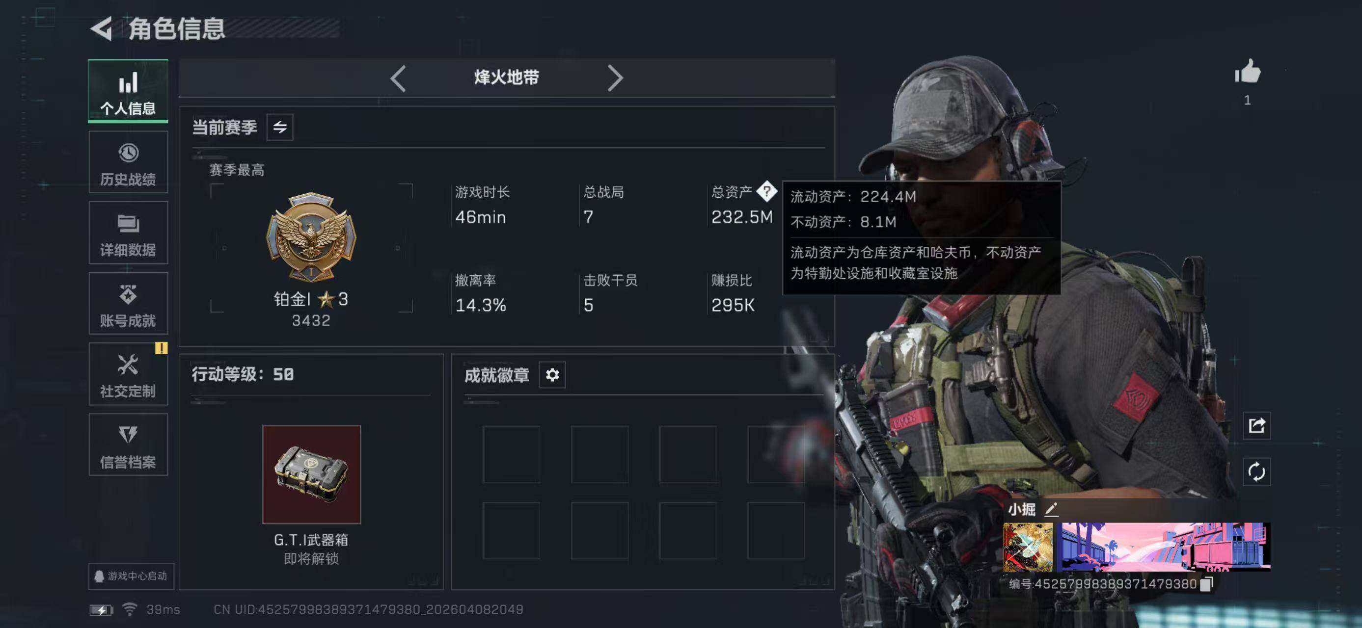 【3064】总资产(M):232M/哈夫币(K):101570K/哈夫币(K):101570K/传说枪皮数:4/全面战场等级:1_段位:无段位/烽火地带等级:50_段位:铂金/近战-暗星/近战-黑鹰/QBZ95-1突击步枪-凌霄戍卫/MK47突击步枪-暗星/SR-3M紧凑突击步枪-暗星/SKS射手步枪-骑士/K416突击步枪-冬日风情/MP5冲锋枪-竞技风/Vector冲锋枪-阿萨拉文明/PKM