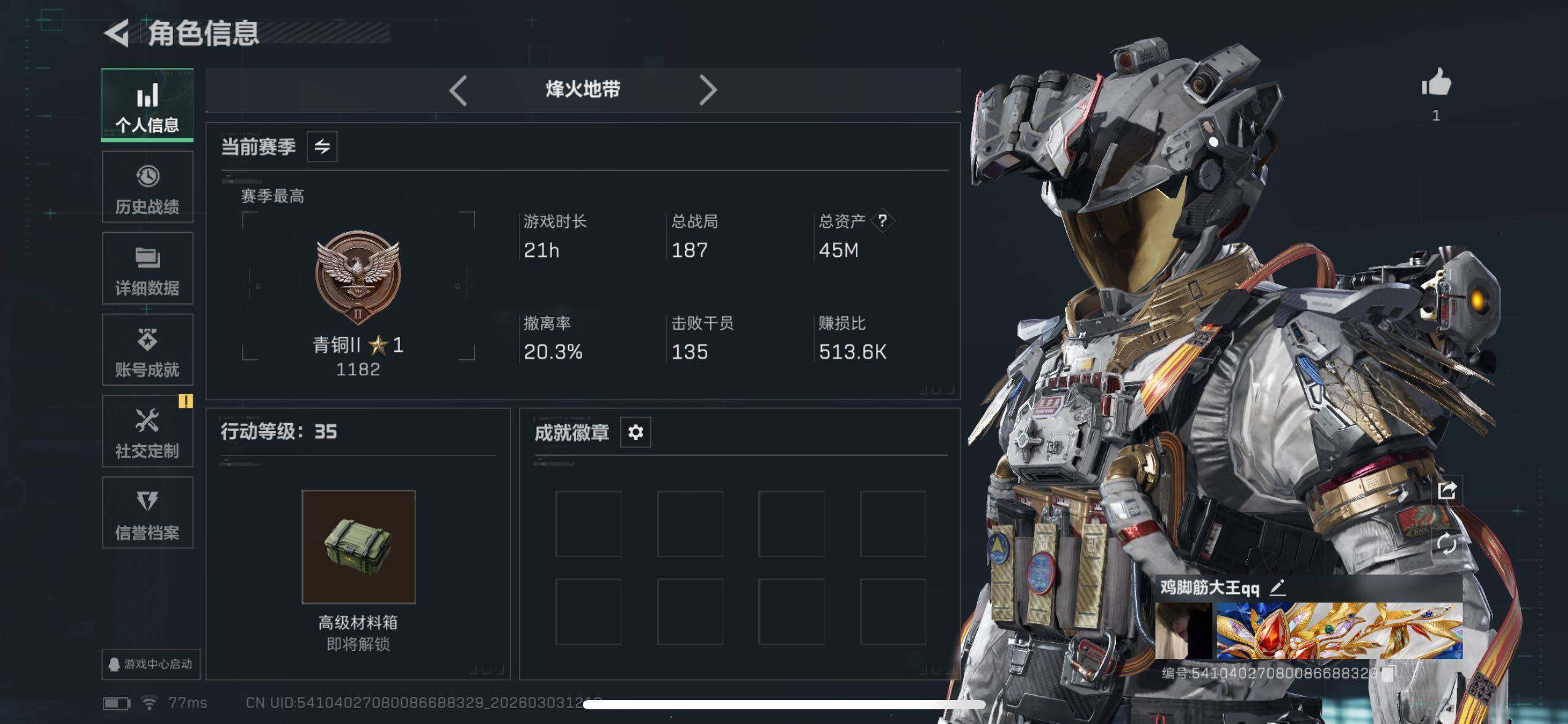 46m总资产-182k哈夫币-45烽火等级-铂金-15战场等级-上等兵