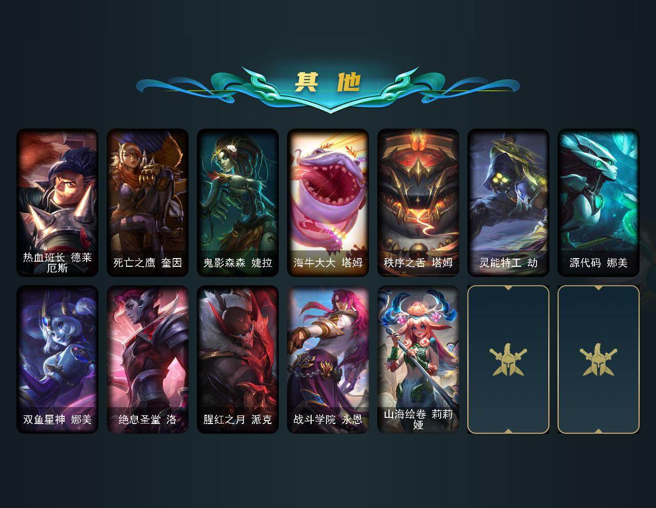 【限定皮肤】:暗裔英雄盖伦,泳池派对雷克顿,防暴天使凯尔,海之歌奈德丽,惊悚派对阿木木