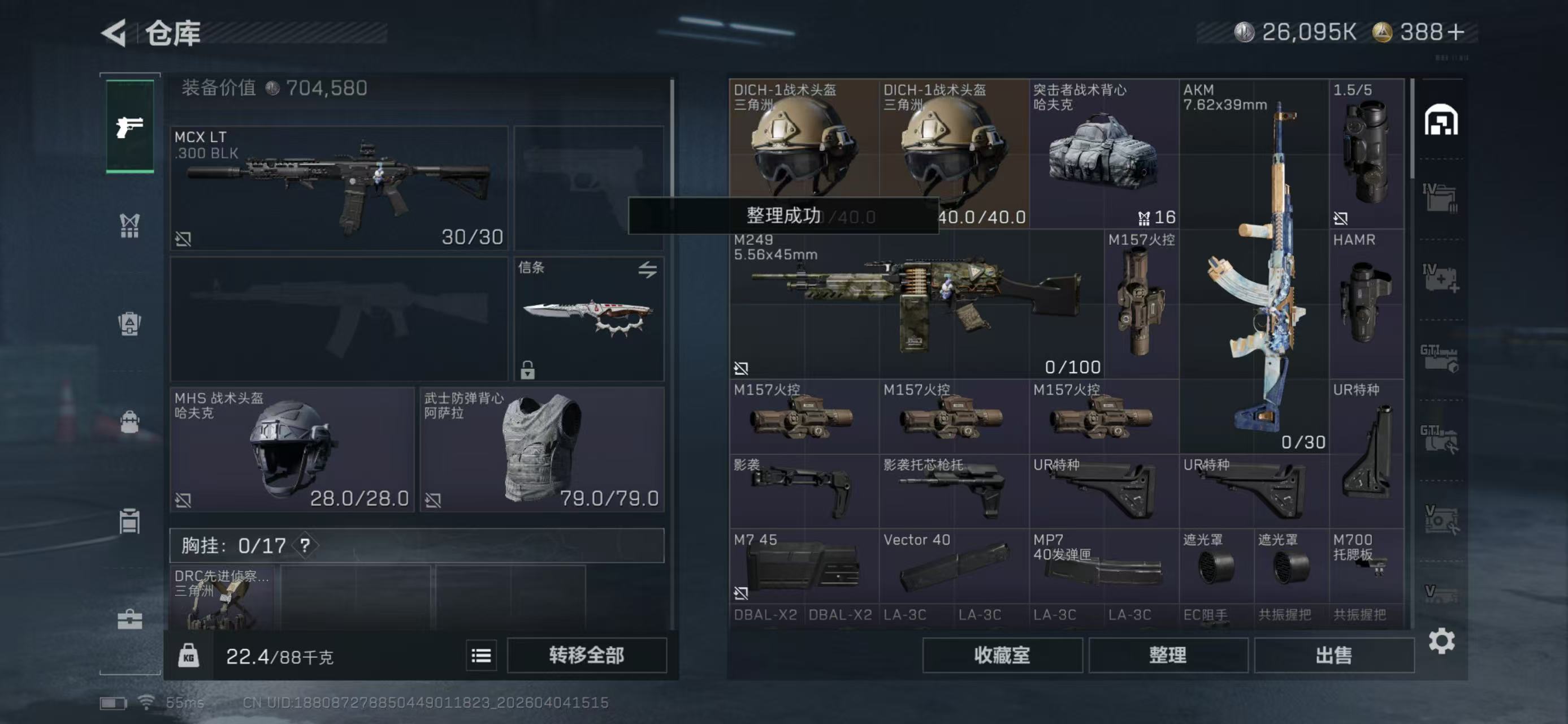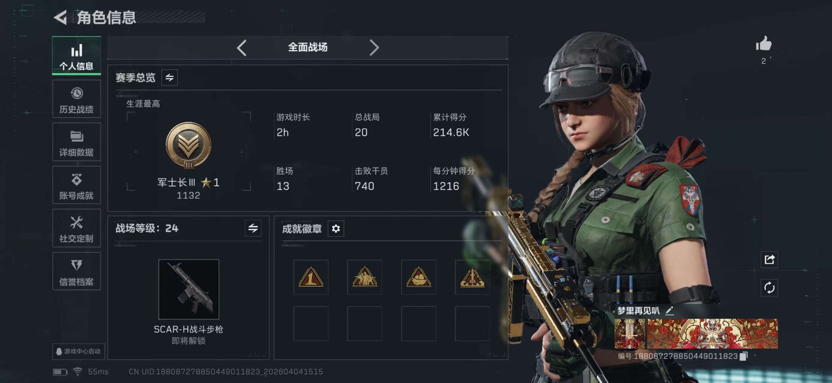 hssjz3167总资产296.54M,哈夫币 26095.85K,战场等级:24 军士长,行动等级:60 黑鹰,角色皮肤2,枪皮数量46【特战干员外观】乌鲁鲁-荒原猎手,蛊-不羁人生,【近战】近战-信条,近战-处刑者,近战-黑鹰,【步枪】AKM突击步枪-锦绣,K416突击步枪-行动记录,腾龙突击步枪-马年祥瑞,腾龙突击步枪-万金泪冠,K437突击步枪-锦绣,SCAR-H战斗步枪-启航,SC