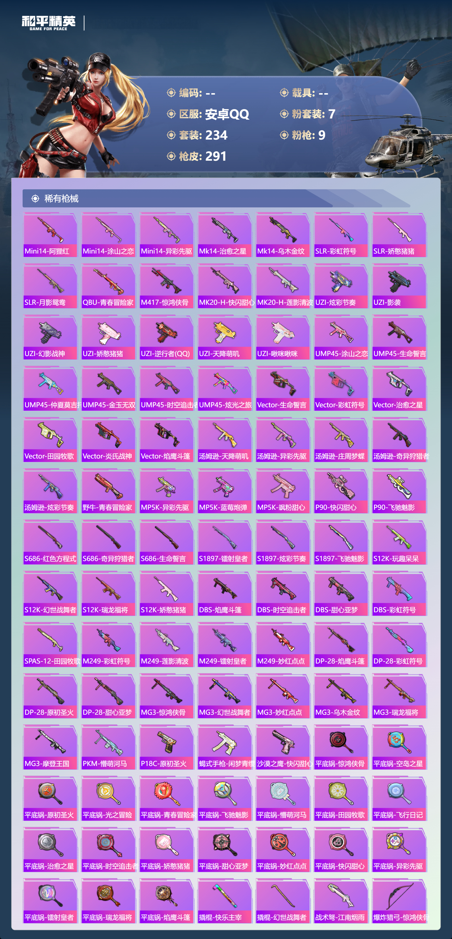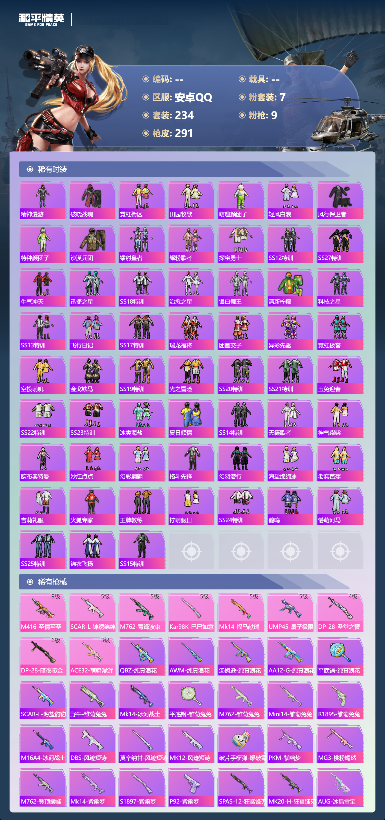 hs68544 安卓手Q-16王牌印记-7粉装-9特效枪-88693热力值-234套装-291枪皮-4卓越印记-1传奇印记