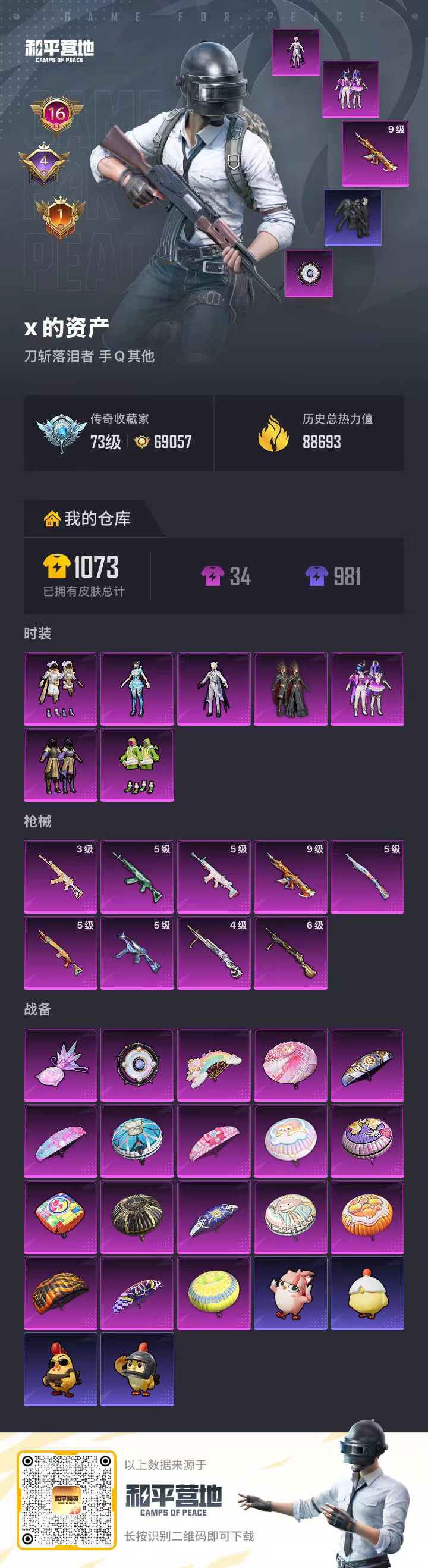 16王牌印记-7粉装-9特效枪-88693热力值-234套装-291枪皮-4卓越印记-1传奇印记