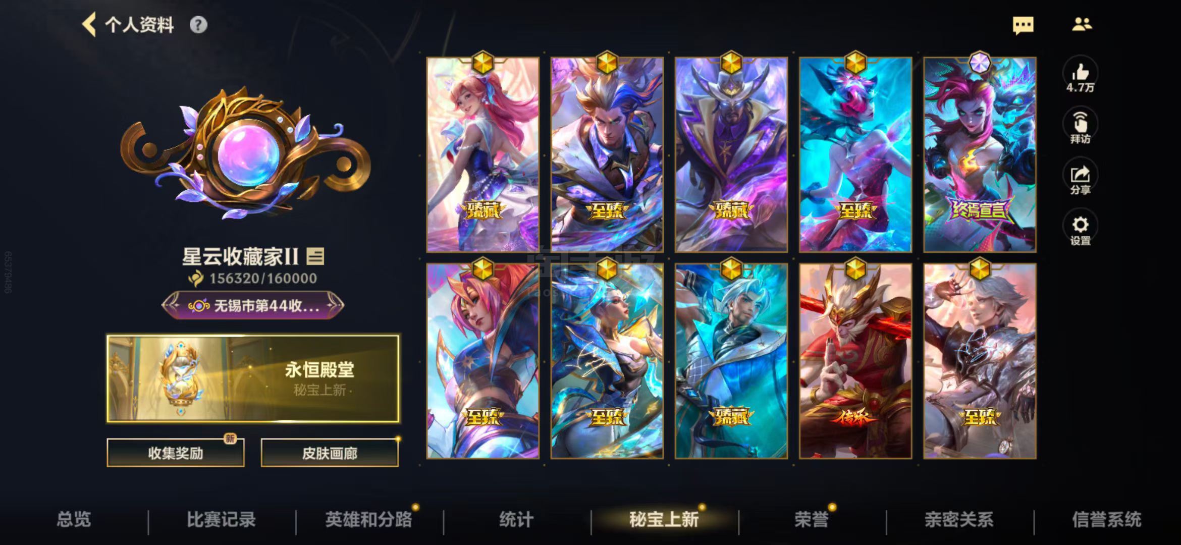 安V,可转果V!粉名!15.6万收藏积分!750皮肤,1终极,4典藏,52神话!凤凰,白龙回城!顶级播报!顶级拖尾!射手路高评分,22级!